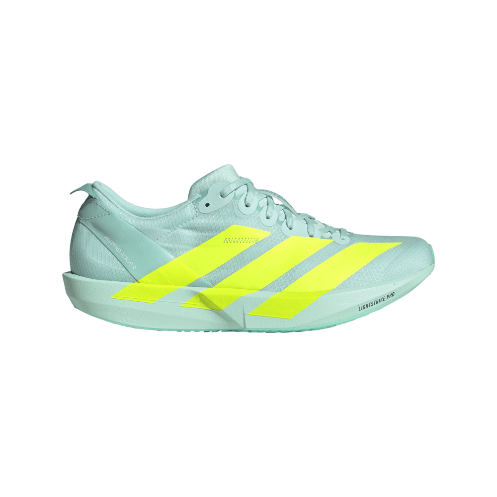 Adizero Adios 9 Damen – Der Laufschuh für neue Bestzeiten Der Adizero Adios 9 wurde für Wettkämpfe entwickelt und ist die perfekte Wahl für Läuferinnen, die auf Geschwindigkeit und Komfort setzen. Mit seiner durchgehenden Lightstrike Pro Zwischensohle bietet er ein leichtes und dynamisches Laufgefühl, das dich bei jedem Schritt voranbringt. Das stretchige Obermaterial aus Mesh sorgt für eine optimale Passform und hohen Komfort, während ein kleines, versteifendes Element in der Zwischensohle das Abrollverhalten unterstützt. Dieses Modell besteht aus mindestens 20 % recycelten Materialien, um die Umweltbelastung zu reduzieren und Müll zu vermeiden. Egal, ob du 5 km oder 20 km läufst – mit dem Adizero Adios 9 bist du auf Rekordjagd. Produktdetails für Damen: Passform : Regulär mit Schnürsenkeln Obermaterial : Textil und stretchiges Synthetik-Mesh für Komfort und Belüftung Zwischensohle : Lightstrike Pro für maximale Dämpfung und Energierückgabe Außensohle : Gummi für optimalen Grip auf verschiedenen Untergründen Gewicht : 177 g (Größe 38 2/3) Sprengung : 7 mm (Rückfußhöhe 27 mm / Vorfußhöhe 20 mm) Einsatzbereich : Wettkämpfe und Training (5–20 km) Nachhaltigkeit : Hergestellt mit mindestens 20 % recycelten Materialien