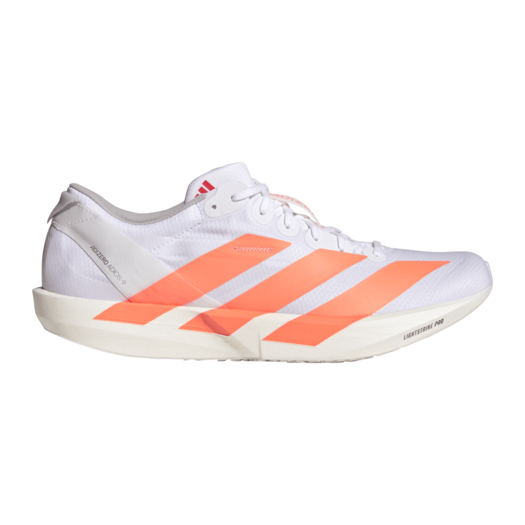 adidas Adizero Adios 9 Herren – Präzision, Reaktivität und Tempo auf höchstem Niveau Der adidas Adizero Adios 9 ist ein Wettkampfschuh für ambitionierte Läufer, die auf der Straße maximale Effizienz und Geschwindigkeit suchen. Die durchgehende LIGHTSTRIKE PRO Zwischensohle liefert reaktive Dämpfung und direkte Energierückgabe – perfekt abgestimmt auf schnelle 3- bis 10-Kilometer-Läufe. Das ADIZERO LIGHTLOCK Obermaterial besteht zu 94 % aus recyceltem Polyester und sorgt dank präzisem 1-Wege-Stretch für optimalen Halt auch bei hohen Geschwindigkeiten. Das integrierte Nylon-Dogbone-Element fördert ein natürliches Abrollen und unterstützt effiziente Bewegungen, während die LIGHTTRAXION-Außensohle mit Continental™ Rubber erstklassigen Grip und minimales Gewicht bietet. Der Adios 9 steht für kompromisslose Direktheit, Dynamik und Präzision bei jedem Schritt. Deine Vorteile im Überblick LIGHTSTRIKE PRO: Reaktive Dämpfung mit maximaler Energierückgabe Nylon-Dogbone-Element: Natürliches Abrollen und direkter Laufstil LIGHTLOCK Obermaterial: Stabiler Sitz mit atmungsaktivem Komfort LIGHTTRAXION + Continental™ Rubber: Grip und Kontrolle bei jedem Tempo Niedriges Profil: Für unmittelbare Reaktion und maximale Geschwindigkeit Nachhaltigkeit: Obermaterial aus recyceltem Polyester gefertigt Technische Details Gewicht: 175 g (Herren) Sprengung: 7 mm (Ferse 27 mm / Vorfuß 20 mm) Dämpfung: LIGHTSTRIKE PRO Foam Platte: Nylon-Dogbone-Struktur für dynamische Flexibilität Außensohle: LIGHTTRAXION + Continental™ Rubber Obermaterial: ADIZERO LIGHTLOCK Mesh (94 % recycelter Polyester) Laufstil: Neutral / Wettkampf / Straße Der adidas Adizero Adios 9 Herren überzeugt durch Leichtigkeit, Reaktionsfreude und präzise Stabilität – entwickelt für Läufer, die auf kurzen und mittleren Distanzen ihr Tempo auf das nächste Level bringen wollen.