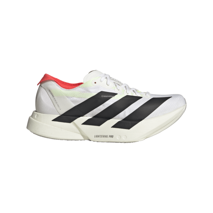 adidas Adizero Adios Pro 4 Damen – Marathon-Performance in ihrer reinsten Form Der adidas Adizero Adios Pro 4 Damen definiert Effizienz und Geschwindigkeit im Langstreckenlauf neu. Entwickelt für ambitionierte Läuferinnen, kombiniert er maximale Energierückgabe, Dämpfung und Stabilität – ideal für Distanzen bis zum Marathon. Die LIGHTSTRIKE PRO Zwischensohle liefert reaktionsfreudige Dynamik bei minimalem Gewicht, während das ENERGYROD 2.0-System aus Carbonfaserstäben den Vortrieb optimiert und die Laufökonomie verbessert. Das ADIZERO LIGHTLOCK Obermaterial aus 94 % recyceltem Polyester umschließt den Fuß mit präzisem Halt und leichtem 1-Wege-Stretch. Für zuverlässige Traktion sorgt die LIGHTTRAXION Außensohle in Kombination mit Continental™ Rubber – für sicheren Grip bei trockenen und nassen Bedingungen. Das Ergebnis ist ein Wettkampfschuh, der Stabilität, Leichtigkeit und Performance in Perfektion vereint. Deine Vorteile im Überblick LIGHTSTRIKE PRO: Ultraleichte, reaktive Dämpfung mit maximaler Energierückgabe ENERGYROD 2.0: Carbonfaserverstärkte Stäbe für effizienten Vortrieb LIGHTLOCK Obermaterial: Passgenau, atmungsaktiv und recycelt LIGHTTRAXION Außensohle: Leicht, griffig und stabil bei jedem Schritt Continental™ Rubber: Sicherer Grip auf nasser und trockener Strecke Nachhaltigkeit: 94 % recycelter Polyester im Obermaterial Technische Details Gewicht: ca. 165 g Sprengung: 6 mm (Ferse 39 mm / Vorfuß 33 mm) Dämpfung: LIGHTSTRIKE PRO Foam Platte: ENERGYROD 2.0 – Carbonfaserverstärkte Polymerstruktur Außensohle: LIGHTTRAXION + Continental™ Rubber Obermaterial: ADIZERO LIGHTLOCK Mesh (94 % recycelter Polyester) Laufstil: Neutral / Straße / Wettkampf Der adidas Adizero Adios Pro 4 Damen ist der ultimative Wettkampfschuh für Marathonläuferinnen – federleicht, reaktiv und entwickelt für persönliche Bestzeiten.