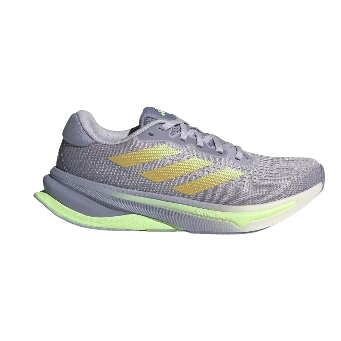 Der adidas Supernova Solution Laufschuh für Damen bietet eine ideale Kombination aus Halt und Komfort, um deine Laufleistung zu optimieren. Die Dreamstrike+ Zwischensohle gewährleistet eine effektive Dämpfung bei jedem Schritt, während die Dual Density Support Rods so konzipiert sind, dass sie ein optimales Abrollverhalten von der Ferse bis zum Vorfuß unterstützen. Das atmungsaktive Obermaterial aus Mesh fördert eine optimale Luftzirkulation, was zu einem angenehmen Tragegefühl beiträgt. Die strapazierfähige Adiwear Außensohle sorgt für hervorragenden Grip, unabhängig von den Laufbedingungen. Die Außensohle des Schuhs ist mit der strapazierfähigen ADIWEAR™-Technologie ausgestattet, die höchste Haltbarkeit bei starker Beanspruchung gewährleistet. Dies verbessert nicht nur die Lebensdauer der Schuhe, sondern auch die Traktion auf verschiedenen Oberflächen. Um aktiv zur Müllreduktion beizutragen, setzt dieser Laufschuh auf den Einsatz von Recyclingmaterialien. Der Schuh besteht zu 70% aus recycelten materialien. Bereits vorhandene Gewebe und Fasern werden wiederverwendet, wodurch Abfall minimiert wird. Zusätzlich werden erneuerbare Materialien verwendet, um die Abhängigkeit von nicht erneuerbaren Ressourcen zu verringern. So steht der Laufschuh nicht nur für erstklassige Performance, sondern auch für ein bewusstes Engagement für Umweltschutz und Nachhaltigkeit. Produktdetails des adidas Supernova Solution Laufschuh: Dreamstrike+ Zwischensohle für eine effektive Dämpfung strapazierfähige Adiwear Außensohle für hervorragenden Grip besteht zu 70% aus recycelten Materialien Gewicht: 240g Sprengung: Farbe: silver dawn / spark / green spark