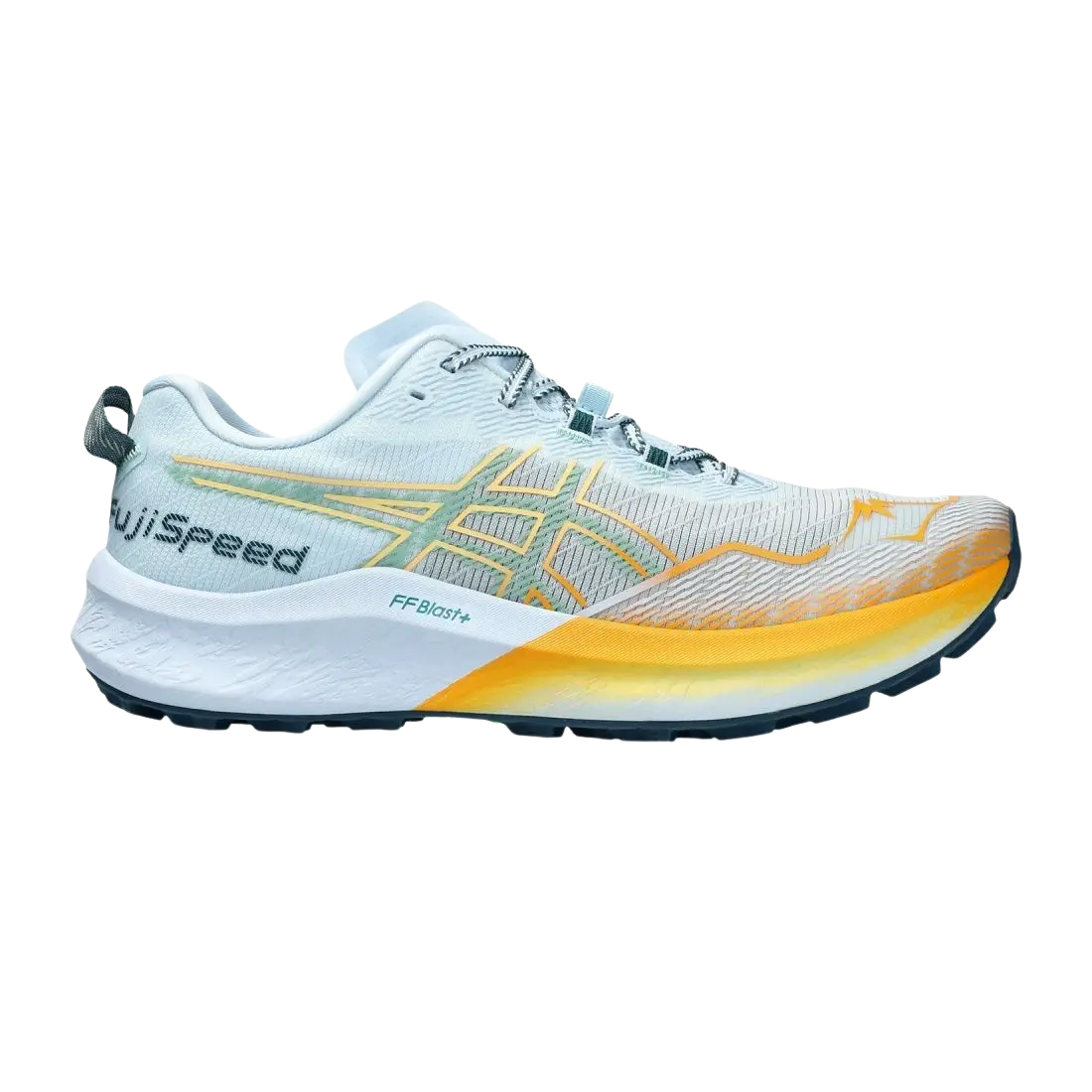 Der asics FUJISPEED™-2 Herren Laufschuh wurde für schnelle Trailläufe entwickelt. Die Passform des Schuhs wurde überarbeitet und verbessert. Das leichte, gewebte Obermaterial bietet die optimale Mischung aus Komfort und Strapazierfähigkeit. Das FF BLAST™ PLUS Dämpfungssystem in der Mittelsohle sorgt für ein leichtes und dynamisches Laufgefühl. Der Schuh verfügt außerdem über eine durchgehende Carbonplatte für mehr Stabilität und Bodenhaftung. Die ASICSGRIP™ Gummiaußensohle verbessert die Traktion auf anspruchsvollem Trail-Gelände. Veganfreundlich: Dieses Produkt enthält keine Materialien tierischen Ursprungs in Design und Materialauswahl, einschließlich der im Produkt verwendeten Garne oder Klebstoffe. *Das Produkt wurde nicht von einer unabhängigen dritten Partei als vegan zertifiziert. Weitere Details zum asics FUJISPEED™-2 Herren Laufschuh: Gewebtes Obermaterial: reduziert das Gewicht des Schuhs und erhöht die Widerstandsfähigkeit gegen Abrieb durch Steine und Wurzeln. Asymmetrisches Schnürsystem: Verringert den Druck auf den Fußrücken. Schnürsenkeltasche GUIDESOLE™ Technologie: Reduziert die Bewegung im Knöchelbereich, um Energie zu sparen. FF BLAST™ PLUS Dämpfung: Sorgt für leichte Dämpfung und reaktionsfreudigen Rebound. Carbonplatte: Lenkt die Energie nach vorne und vermittelt ein Gefühl von Geschwindigkeit. ASICSGRIP™ Laufsohle: Optimaler Grip auf unterschiedlichen Bodenbelägen Gewicht: 234g Sprengung: 5mm Farbe: Light Blue / Dark Mint