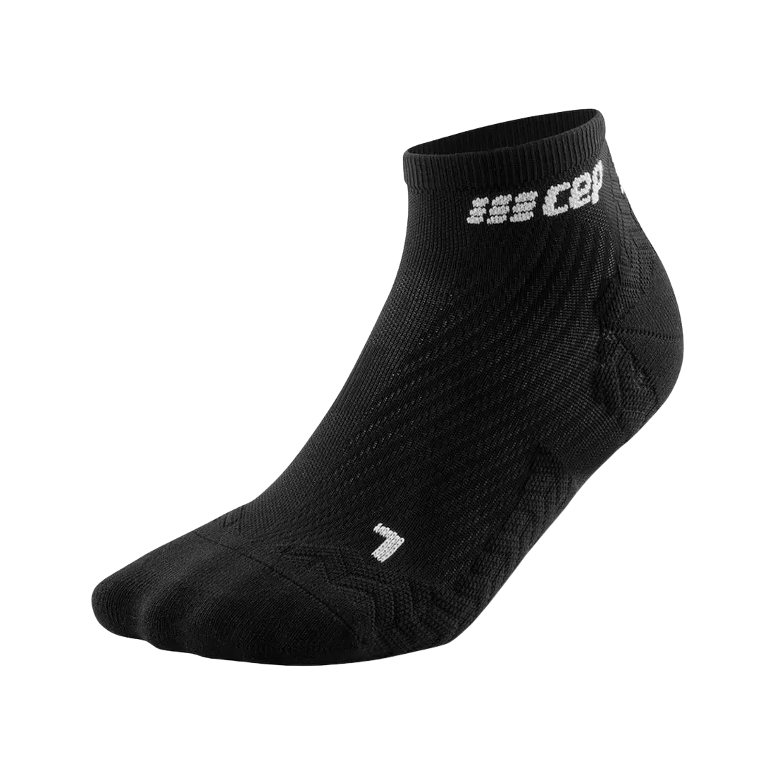 CEP Ultralight Low Cut Socks für Damen : leichte Füße und perfekter Sitz für Work-outs an heißen Tagen. Mit gutem Gefühl mehr leisten und schneller regenerieren – mit den Ultralight Low Cut Socks für Damen fühlst du dich an heißen Tagen auch bei intensiven Sporteinheiten wohl. Die Sportsocken unterstützen dich beim Abrufen deiner besten Leistung, sei es im Training oder beim Wettkampf. Sie sitzen rutschfest und lassen sich auch in engen Sportschuhen bequem tragen. Zugleich steigern die leichten Damen-Sportsocken deine Motivation, indem sie dich mit einem Feel-Good-Effekt an den Füßen vorantreiben! Resistent und ultraleicht – deine Sommersocken für mehr Power Mit den Sportsocken für den Sommer spürst du dank zusätzlicher medi compression einen Zugewinn an Kraft und Leichtigkeit. Die Kompression übt genau an den richtigen Stellen Druck auf deine Fußmuskulatur aus und sorgt so für einen sicheren Halt. Zusätzlich stabilisiert die tiefensensorische Stimulation der Gelenke deine Füße. Atmungsaktivität und hohe Festigkeit dank Smart Carbon Mit den Ultralight Compression Low Cut Socks für Damen definierst du dein Wohlbefinden beim Laufen neu. Die ultradünnen Sportsocken aktivieren dein volles Leistungspotenzial. Dank der anatomischen Passform mit asymmetrischer Zehenbox und dem bewährten Materialmix mit Smart-Carbon-Garn minimieren sie die Blasenbildung in engen Sportschuhen. Das Material transportiert Feuchtigkeit von der Haut weg und deine Füße bleiben angenehm kühl. Das superleichte Garn mit Carbon steigert die Elastizität und Festigkeit. Erreiche mit den Ultralight Low Cut Socks für Damen deine Ziele Mehr Kraft im Fuß – die Sportsocken unterstützen dich perfekt beim Training und im Wettkampf, damit du dein Potenzial voll ausschöpfst und deine Ziele erreichst. Trage die Sommersocken an heißen Tagen und genieße das verbesserte Laufgefühl. Mit ihrer kurzen Länge eignen sich die Sportsocken mit medi compression perfekt für Sportarten wie Laufen, Triathlon, Radfahren, Ausdauertraining und für den Teamsport. Wähle die Ultralight Low Cut Socks für Damen in deinen Farben aus, bestelle sie jetzt online und erlebe das einzigartige Tragegefühl! Material: 88 % Polyester, 12 % Elasthan