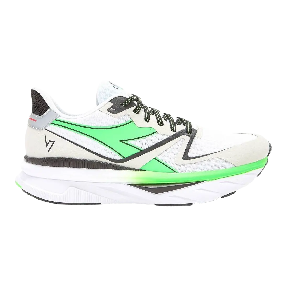 Nach mehr als 40 Jahren steht der Laufsport wieder ganz im Zeichen italienischer Qualität und Kompetenz. Technologische Innovation, handwerkliches Können und kreatives Design verschmelzen zu einem Schuh, der dazu bestimmt ist, Kultstatus zu erreichen. Der Atomo V7000 zeichnet sich durch optimale Dämpfung und Komfort aus – die herausragende Eigenschaften aller Diadora Running-Produkte – und ist zudem erstaunlich leicht und reaktionsfreudig, was durch den Einsatz einer neuen Technologie gewährleistet wird: der speziellen “dd-anima”-Mischung. Die neue dd anima Technologie zeichnet sich neben der hohen Dämpfung durch extreme Leichtigkeit und Reaktivität aus. Kombiniert mit der Wirkung des Federpebax-Schaftes sorgt sie für Vortrieb und Energieeinsparung und erleichtert den Übergang des Fußes von der Aufprallphase zur Schubphase für einen reibungslosen und schnellen Lauf. Gewicht: 260g Sprengung: 5mm