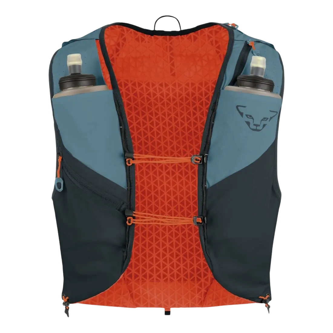 Die Dynafit Alpine 8 Vest ist eine vielseitige Laufweste für kurze und mittlere Distanzen. Komfortabel, vielseitig und unverzichtbarer Partner für Trailläufe aller Art. Die Alpine 8 Laufweste überzeugt durch ein funktionales Taschen-Setup für Verpflegung und Equipment sowie durch die individuell versetzbare Stockbefestigung. Alles dabei beim Trail Running: Die Alpine 8 Unisex Laufweste überzeugt als Allrounder mit durchdachtem Design und perfektem Sitz auf kurzen und mittleren Distanzen. Die leichte, komfortable und vielseitige Alpine 8 Laufweste ist Dein perfekter Running-Buddy für jeden Trail Run. Sie sitzt wie eine zweite Haut und bietet Dir jede Menge Platz für Dein Equipment sowie eine clevere Fächeraufteilung, um spielend leicht Ordnung zu halten. Das Hauptfach am Rücken ist unterteilt in zwei überlappende Fächer. Das Fach nahe am Rücken ist zugänglich über den Reißverschluss oben am Nacken sowie einen Reißverschluss unten. Das zweite Fach verfügt unten ebenfalls über einen Reißverschluss. So ist die Weste einfach zu packen und Deine Sachen sind auch während des Laufens mit nur einem Handgriff erreichbar. Außerdem besitzt die Alpine 8 vorne, auf der Seite und hinten weitere Stretchtaschen zum Verstauen von Kleinigkeiten sowie eine abnehmbare wasserdichte Tasche für Smartphone und Co., die Du flexibel in der Laufweste verstauen kannst, wenn Du sie nicht benötigst. Besonderes Augenmerk haben die Entwickler auf die Passform gelegt, denn nichts ist beim Laufen störender als eine Laufweste, die auf und ab hüpft. Durch das 3D Mesh überzeugt die Weste mit einem komfortablen Sitz auch nach vielen Kilometern auf der Uhr. Die Passform der Weste kannst Du außerdem über die doppelten elastischen Verschlüsse und die seitliche Regulation perfekt an Deine Größe und Körperform anpassen. Ein weiteres Highlight der Alpine 8 Laufweste ist die Stockfixierung. Hier stehen gleich drei verschiedene Befestigungsmöglichkeiten bereit: vorne vertikal, hinten vertikal oder hinten horizontal als „V“ – ganz so wie Du es am liebsten magst. Im Lieferumfang bereits enthalten sind außerdem zwei 500 ml Softflasks mit breiter Öffnung für schnelles Befüllen. Natürlich kannst Du die Laufweste aber auch mit einer Trinkblase nutzen. Die Dynafit Alpine 8 Laufweste auf einen Blick: Inklusive zwei 500 ml Soft Flasks Stretch-Taschen Repositionierbare Stockfixierung Seitliche verstellbar Abnehmbare wasserdichte Tasche Reflektierende Details Höhenverstellbarer Brustgurt Sicherheitspfeife Leicht zugängliche Taschen Gewicht: 235g Volumen: 8 L Farbe: storm blue
