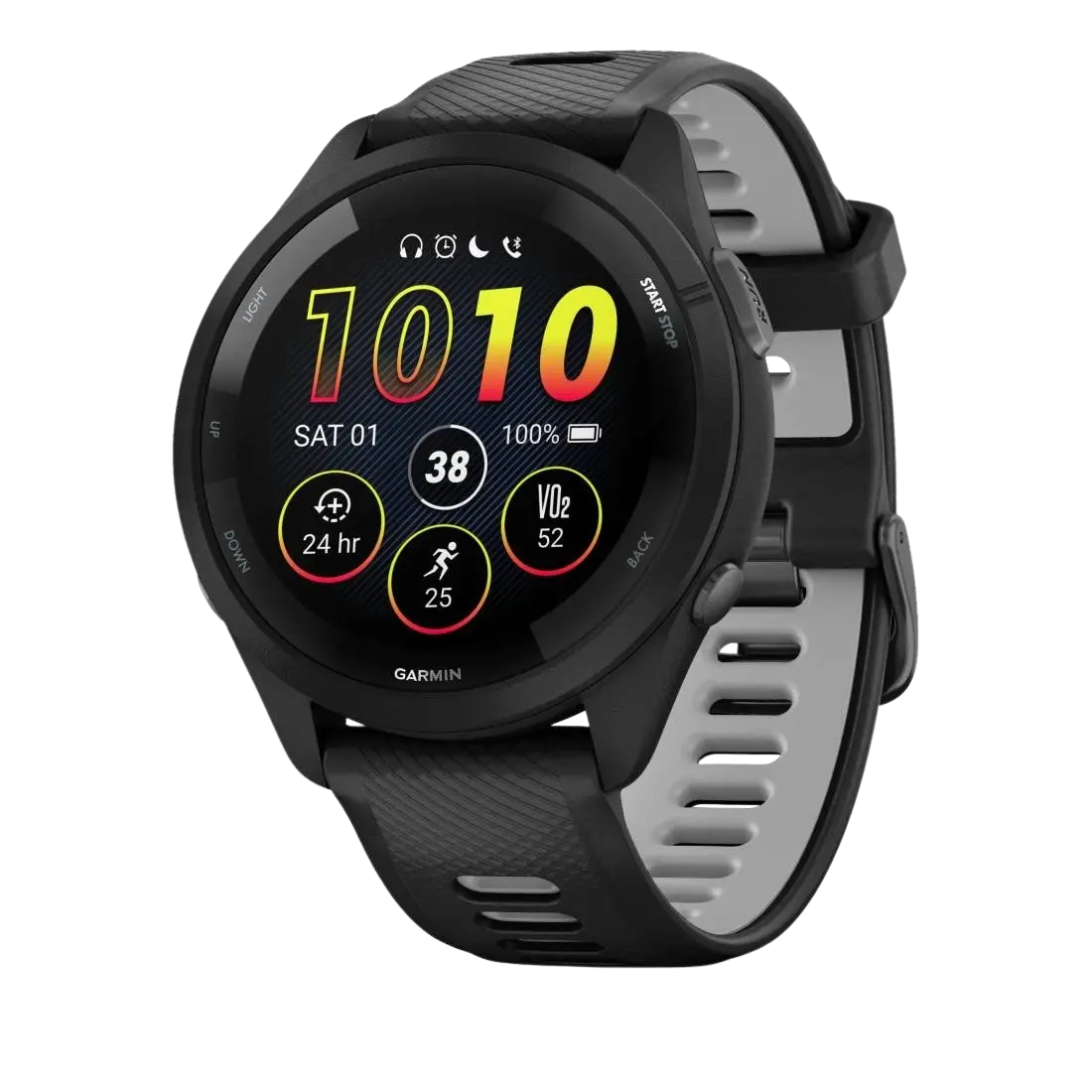 Train brilliantly – mit der Garmin Forerunner® 265 Serie mit AMOLED Display. Mit diesen smarten Laufuhren verbesserst du deine Pace, steigerst deine Leistung und kommst deinen persönlichen Zielen stetig näher. Dank brillantem 1,1 bzw. 1,3 Zoll AMOLED Display sowie Touch- und Tastenbedienung kannst du Einstellungen intuitiv und schnell vornehmen. Innovative Trainingsfunktionen, wie die Trainingsbereitschaft, liefern dir basierend auf Trainingsstatus, Erholungszeit und Herzfrequenzvariabilität Erkenntnisse darüber, ob du für deine nächste Trainingseinheit bereit bist. Die umfangreichen physiologischen Messwerte helfen dir, dein Training effizient zu gestalten. Mit dem Garmin Coach, individuellen Trainingsplänen und mehr bereitest du dich bestens auf deinen nächsten Lauf vor. Und auch im Alltag hast du dank smarten Features wie Garmin Pay1, Garmin Music4 und Smart Notifications den idealen Begleiter am Handgelenk. HIGHLIGHTS zur Garmin Forerunner 265 mit AMOLED Display: Smarte Laufuhr mit AMOLED-Touchdisplay und Tastenbedienung Vorinstallierte Multisport-Apps, wie u.a. Triathlon, Laufen, Radfahren, Freiwasserschwimmen Trainingsbereitschaft – Insights, inwieweit der Körper bereit ist für ein Training basierend auf Trainingsstatus, Erholungszeit und HFV3 Messung der Herzfrequenzvariabilität während des Schlafs für einen täglichen sowie 7-Tages-Durchschnitt Running Power ohne kompatibles Zubehör Umfangreiche physiologische Messwerte und Trainingsfunktionen Hochpräzise Positionsbestimmung durch Multi-Frequenz Empfang8 Smarte Funktionen wie Garmin Pay1 & Garmin Music4