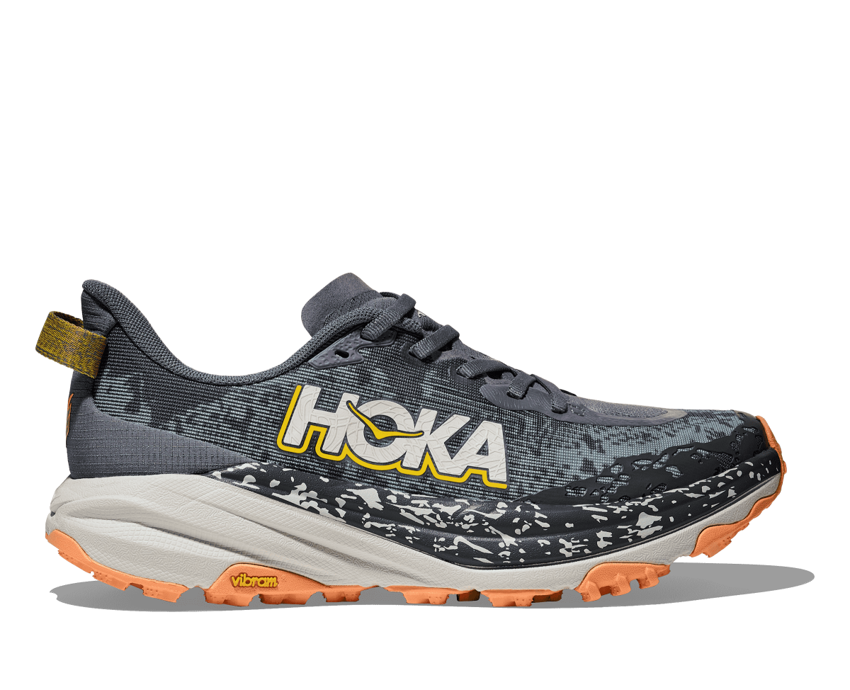 Hoka SPEEDGOAT 6 Damen – Volle Performance für technische Trails Der Hoka SPEEDGOAT 6 wurde speziell für Trail-Läuferinnen entwickelt, die sich auf jedem Untergrund auf ihren Schuh verlassen möchten. Diese neue Version kombiniert bewährte Dämpfung mit mehr Reaktionsfreudigkeit, reduziertem Gewicht und einem optimierten Bodengefühl – ideal für anspruchsvolles, technisches Gelände. Die überarbeitete CMEVA-Zwischensohle sorgt für ein weiches, gleichzeitig dynamisches Laufgefühl. Vibram® Megagrip mit 5?mm tiefen Stollen verleiht dir bei Auf- und Abstiegen den nötigen Grip – selbst bei nassem oder losem Untergrund. Das neu entwickelte, atmungsaktive Sandwich-Mesh-Obermaterial sitzt angenehm am Fuß und ist gleichzeitig robust genug für steinige Trails. Die doppelt verstärkte Zunge schützt zusätzlich vor dem Eindringen von Staub und Schmutz. Umweltbewusst gedacht: Der Speedgoat 6 setzt auf recyceltes Polyester – in Mesh und Schnürsenkeln. Eine integrierte Fußstütze verbessert zudem die Passform und Stabilität – für ein sicheres Gefühl bei jedem Schritt. Technische Details: Gewicht: 232 g Sprengung: 5 mm Zwischensohle: Reaktionsfreudiger CMEVA-Schaum Außensohle: Vibram® Megagrip mit 5-mm-Stollen Obermaterial: Sandwich-Mesh mit recyceltem Polyester Innenkonstruktion: Zwickelzunge und Fußstütze für passgenauen Halt Ob felsige Trails oder matschige Pfade – der SPEEDGOAT 6 gibt dir Grip, Komfort und Kontrolle, damit du selbst anspruchsvolle Trails souverän meisterst.
