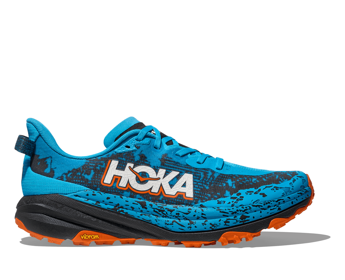 Hoka SPEEDGOAT 6 Herren – Dein Partner für technisches Terrain Mit dem Hoka SPEEDGOAT 6 hast du den perfekten Begleiter für herausfordernde Trailkilometer unter deinen Füßen. Der beliebte Trailschuh wurde grundlegend überarbeitet, um noch leichter, dynamischer und griffiger zu sein – bei unverändert hoher Stabilität und Dämpfung. Ideal für Läufer, die bergauf wie bergab maximale Performance suchen. Die neue CMEVA-Zwischensohle sorgt für eine reaktive Dämpfung bei reduziertem Gewicht und bietet damit ein agiles, direktes Laufgefühl. Die Vibram® Megagrip-Außensohle mit 5?mm tiefen Stollen bietet kompromisslosen Halt auf losem Untergrund, nassem Fels oder matschigen Trails. Durch die überarbeitete Außensohlenstruktur, inspiriert von der Hufstruktur einer Ziege, profitierst du zudem von noch mehr Trittsicherheit. Das atmungsaktive Obermaterial mit dynamischem Sandwich-Mesh hält deine Füße kühl und trocken, während die doppelt verstärkte Zunge und eine integrierte Fußstütze für passgenauen Halt sorgen. Umweltfreundlich wird’s obendrein: Sowohl das Obermaterial als auch die Schnürsenkel bestehen aus recyceltem Polyester. Technische Details: Gewicht: 278 g Sprengung: 5 mm Zwischensohle: reaktionsfreudiger CMEVA-Schaum Außensohle: Vibram® Megagrip mit 5-mm-Stollen Obermaterial: Sandwich-Mesh mit recyceltem Polyester Innenkonstruktion: Integrierte Fußstütze und Zwickelzunge für Stabilität und Schutz Mit dem Speedgoat 6 meisterst du selbst die härtesten Trails mit Leichtigkeit – schnell, stabil und voller Grip.