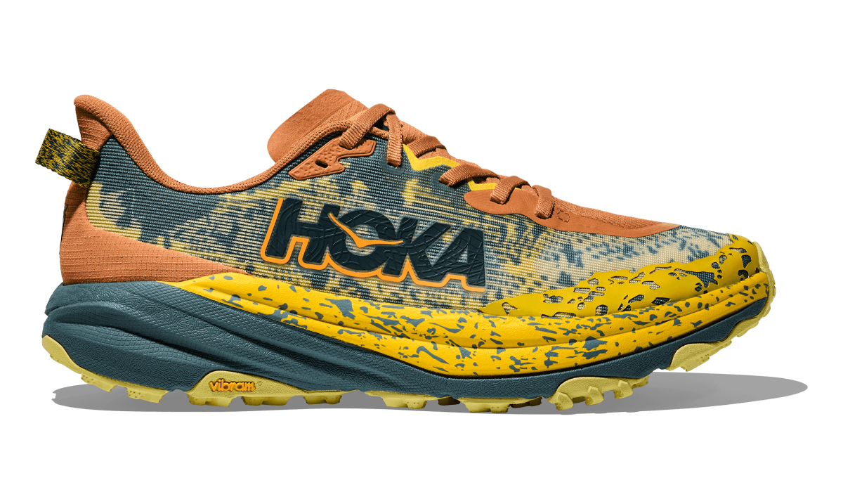 Hoka SPEEDGOAT 6 Herren – Dein Partner für technisches Terrain Mit dem Hoka SPEEDGOAT 6 hast du den perfekten Begleiter für herausfordernde Trailkilometer unter deinen Füßen. Der beliebte Trailschuh wurde grundlegend überarbeitet, um noch leichter, dynamischer und griffiger zu sein – bei unverändert hoher Stabilität und Dämpfung. Ideal für Läufer, die bergauf wie bergab maximale Performance suchen. Die neue CMEVA-Zwischensohle sorgt für eine reaktive Dämpfung bei reduziertem Gewicht und bietet damit ein agiles, direktes Laufgefühl. Die Vibram® Megagrip-Außensohle mit 5?mm tiefen Stollen bietet kompromisslosen Halt auf losem Untergrund, nassem Fels oder matschigen Trails. Durch die überarbeitete Außensohlenstruktur, inspiriert von der Hufstruktur einer Ziege, profitierst du zudem von noch mehr Trittsicherheit. Das atmungsaktive Obermaterial mit dynamischem Sandwich-Mesh hält deine Füße kühl und trocken, während die doppelt verstärkte Zunge und eine integrierte Fußstütze für passgenauen Halt sorgen. Umweltfreundlich wird’s obendrein: Sowohl das Obermaterial als auch die Schnürsenkel bestehen aus recyceltem Polyester. Technische Details: Gewicht: 278 g Sprengung: 5 mm Zwischensohle: reaktionsfreudiger CMEVA-Schaum Außensohle: Vibram® Megagrip mit 5-mm-Stollen Obermaterial: Sandwich-Mesh mit recyceltem Polyester Innenkonstruktion: Integrierte Fußstütze und Zwickelzunge für Stabilität und Schutz Mit dem Speedgoat 6 meisterst du selbst die härtesten Trails mit Leichtigkeit – schnell, stabil und voller Grip.