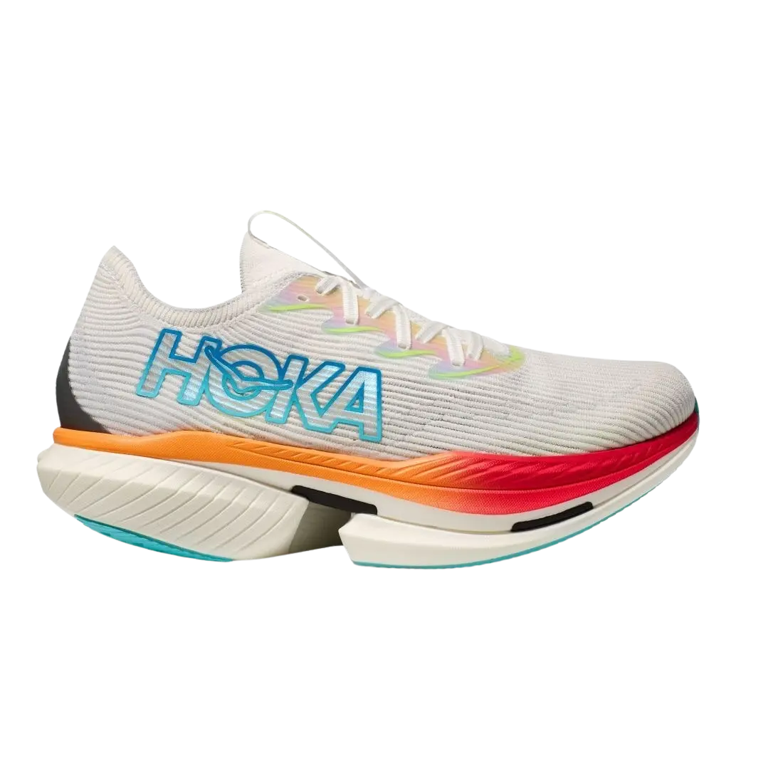 Der Hoka one one CIELO X1 Laufschuh – ein Schuh mit Vortrieb für höchste Geschwindigkeiten. Bei der Entwicklung des neuen Cielo X1 hat Hoka vor allem die Geschwindigkeit im Blick gehabt. Dieser ultraschnelle Straßenlaufschuh ist mit seinen dynamischen Cut-outs superleicht und verfügt über eine gewölbte Carbonfaserplatte, die von zweilagigem, widerstandsfähigem PEBA-Schaumstoff eingefasst wird. Mit dem gebogenen Design aus atmungsaktivem Strick und der gestrickten Lasche mit Zwickel bist du für den nächsten Wettkampf bestens gerüstet. Die reaktionsfähige 4-mm-Einlegesohle unterstützt deinen Laufkomfort, während der minimale Gummiüberzug an der Laufsohle für verbesserte Traktion sorgt. Das strapazierfähige Rocker-Design rundet das Gesamtpaket ab, sodass du bestens für den nächsten Wettkampf gerüstet bist. Produktdetails des Hoka CIELO X1: Obermaterial und Manschette aus Strick Asymmetrische, gestrickte Lasche mit Zwickel Widerstandsfähige Zwischensohle aus zwei PEBA-Schichten Carbonfaserplatte mit Flügeln Dynamische Cut-outs Reaktionsfähige 4-mm-Einlegesohle Minimaler Gummiüberzug an der Laufsohle Strapazierfähiges Rocker-Design Gewicht: 253g Sprengung: 7mm Farbe: frost / cerise