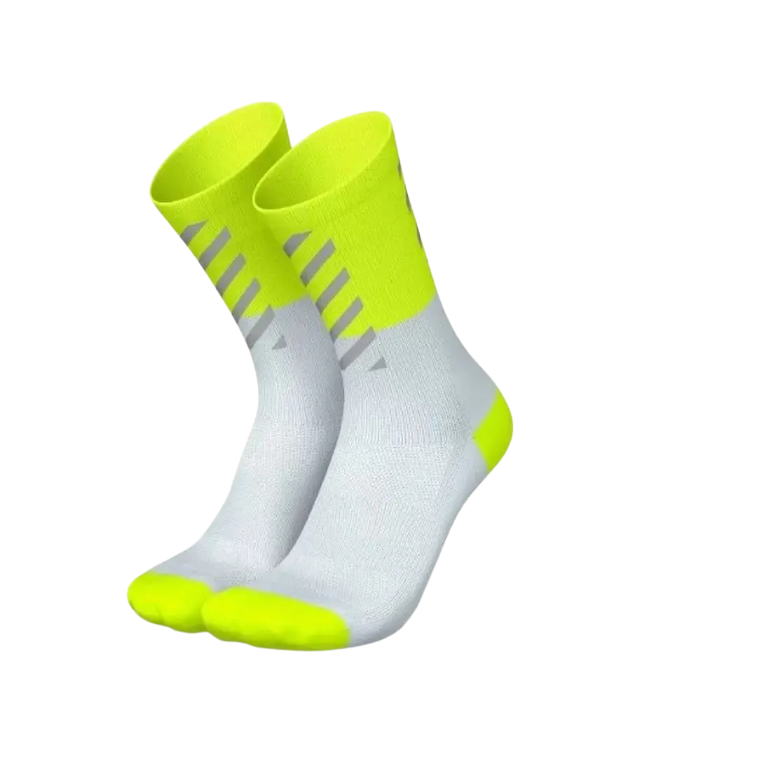 Die Incylence High-Viz V2 Socken sind herausragend was Sichtbarkeit und Sicherheit angeht. Großflächige reflektierende Elemente und prägnante Farben garantieren eine großartige Sichtbarkeit zu jeder Tageszeit. Die Incylence High-Viz V2 Socken bestehen zu 65% aus RECO® NYLON, einer recycelten Nylon Faser, die bei früheren Produktionen keine Verwendung gefunden hat. In Portugal produziert bieten die Socken exzellente Atmungsaktivität, Robustheit und gleichzeitigen Komfort. Extra Dämpfung unter dem Vorfuß und im Bereich der Ferse sorgen für ein angenehmes Tragegefühl, egal wie lang und intensiv die Einheit ist. Weitere Informationen zur Incylence High-Viz V2: RECO® NYLON – recycelt | hochfunktionell | atmungsaktiv | leicht | langlebig | nachhaltig Reflektierende Elemente für extra Sichtbarkeit Doppelt gelegter Bund nimmt optimal Feuchtigkeit auf Kompression für verbesserte Durchblutung Perfekte Passform Solltest Du zwischen zwei Größen stehen, empfehlen wir Dir für eine optimale Passform die jeweils kleinere Größe zu nehmen. Material und Pflege 65% RECO® Nylon (recyceltes Nylon) 30% Polyamide 4% Elastan 1% Polyester (reflektierender Streifen) Bei 30°C waschen Nicht im Wäschetrockner trocknen Nicht bügeln