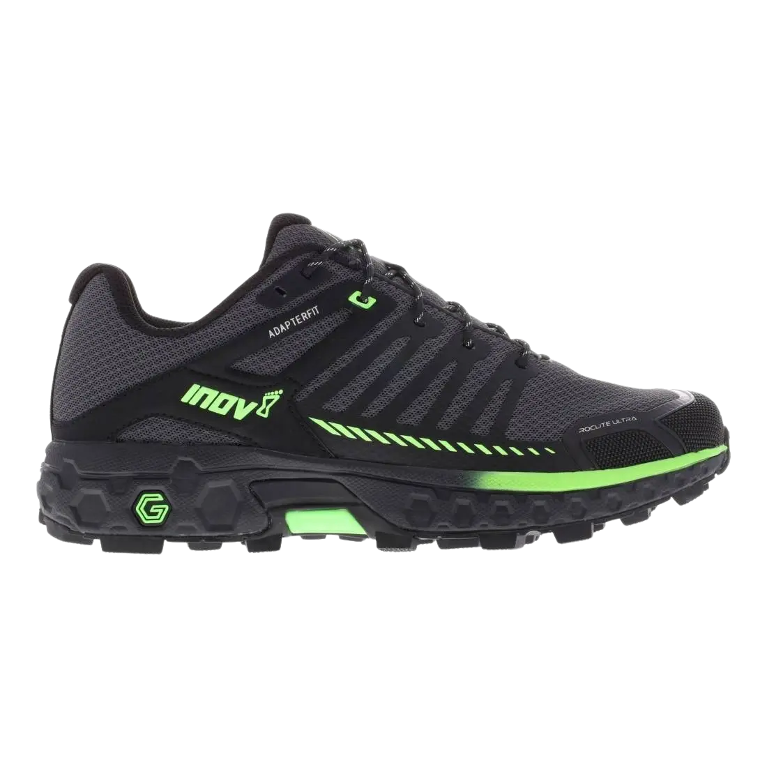 Der erste Inov-8 ROCLITE ULTRA G320 mit Graphene im Gummi und im Schaumstoff wurde entwickelt, um Läufer über ihre Distanzgrenzen hinaus zu bringen – egal in welchem Terrain. Ob auf dem Trail oder abseits des Trails, die extrem widerstandsfähigen 6-mm-Graphen-GRIP-Stollen beißen und halten auf jedem Untergrund, von hartem Fels bis zu weichem Moor. Der gepolsterte G-FLY Graphene-Schaumstoff bietet eine um 25 % höhere Energierückgabe, die länger anhält, während ein superstarkes neues Mesh-Obermaterial, eine flexible Rockplate und ein verstärkter Zehenschutz die Füße schützen. Eine Weiterentwicklung des ROCLITE G 275, mit verbesserter Sprungkraft, Dämpfung und Schutz für das Sammeln von mehr Kilometern. Weitere Vorteile des Inov-8 ROCLITE ULTRA G320: Der mit Graphen verstärkte Gummi bietet den stärksten Grip der Welt – wahnsinnig klebrige Traktion UND erhöhte Haltbarkeit, ohne Kompromisse. 50 % stärker, 50 % elastischer, 50 % strapazierfähiger, wissenschaftlich erwiesen. Die 6 mm tiefen ROCLITE-Stollen sind für ihre Vielseitigkeit bekannt und bieten auf allen Arten von Gelände, egal wie hart oder weich, Biss und Halt. Die Stollen wurden außerdem sorgfältig positioniert, um zu verhindern, dass Geröll an der Außensohle haften bleibt. Der mit Graphen verstärkte G-FLY Dämpfungsschaum ist verschleißfester. Er behält seine Dicke und die optimale Energierückgabe länger bei und hilft dem Läufer, sich über längere Strecken schneller und frischer zu fühlen. Unglaubliche Energierückgabe UND erhöhte Haltbarkeit, keine Kompromisse. Der revolutionäre Schaumstoff bietet 25 % mehr Energierückgabe. Labortests haben gezeigt, dass der Schaumstoff selbst dann, wenn er gealtert ist, um eine intensive Nutzung zu simulieren, immer noch eine höhere Energierückgabe bietet als einige ungealterte Schaumstoffe. Die Leistung ist auch nach 1.200 km noch gut – doppelt so hoch wie der Industriestandard. Die BOOMERANG-Einlegesohle verfügt über Hunderte von expandierten TPU-Kügelchen, die komprimiert werden und zurückfedern, um eine höhere Energierückgabe und eine bessere Dämpfung als bei herkömmlichen Einlegesohlen zu erzielen. Die 4 mm dicke Sohle behält ihr optimales Leistungsniveau länger bei und transportiert gleichzeitig unerwünschte Feuchtigkeit ab. Eine zusätzliche flexible Felsplatte, METAPLATE genannt, bietet mehr Schutz vor Felsen unter dem Fuß, ohne das Bodengefühl zu beeinträchtigen. Der verstärkte Zehenschutz bietet zusätzlichen Schutz im oberen Bereich. Das neue Mesh-Obermaterial ist nachweislich über 25 % haltbarer als das vorherige Material und hilft Läufern, mehr Kilometer aus ihren Schuhen herauszuholen. Superrobust und dennoch flexibel. Wenn die Füße bei längeren Abenteuern anschwellen, können Sie dank des ADAPTERWEB-Obermaterials, das sich an Ihre veränderte Fußform und Ihre natürlichen Bewegungen anpasst, zusätzlichen Komfort genießen. Das Obermaterial ist außerdem nicht wasserabsorbierend. Die ADAPTER-FIT-Technologie bildet eine stützende Wiege zwischen Ferse und Fußgewölbe, die für ein sicheres Gefühl sorgt und die Stabilität in unwegsamem Gelände erhöht. Stack-Höhen (nur Zwischensohle) von 20 mm im Fersenbereich und 12 mm im Vorfußbereich in Kombination mit einer 8-mm-Absenkung sorgen für viel Komfort unter den Füßen.