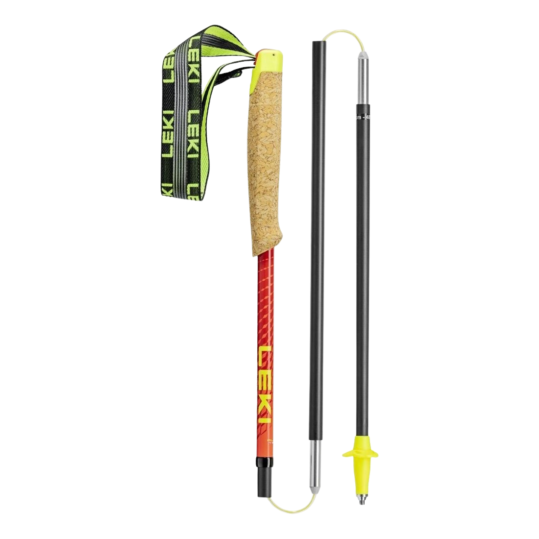 Der Leki NEOTRAIL PRO FX.ONE SUPERLITE Trailrunningstock ist die neueste Entwicklung aus dem Hause Leki. Die Hauptunterschiede zu den bisherigen Modellen finden sich in der neuen Gestaltung des Griffs und der Schlaufe wieder. Ohne Triggersystem mit extrem leichter Schlaufenführung. Ein Umgreifen des Stocks ist daher bei Bergabpassagen einfach möglich. Der neue Neotrail Pro FX.One Superlite ist mit nur 120 g (bei 120 cm) einer der leichtesten Stöcke, den LEKI jemals entwickelt hat. 100% gewichtsoptimiert und perfekt für technisches Terrain. Der Spartan Griff basiert auf Feedback von Spitzenathlet:innen und verbindet Minimalismus mit Vielseitigkeit. Er ist mit einer ultraleichten und schnelltrocknenden D-Loop Mesh Strap ausgestattet, das neue Schlaufenmaterial garantiert höchste Atmungsaktivität und Rücktrocknung. Mithilfe der Exzenterkappe lässt sich die Schlaufe in Sekundenschnelle einstellen, sodass man beim Rennen keine Zeit verliert. Der leichte Foamgriff hat abgeflachte Seitenwangen für noch bessere Führung bei hoher Geschwindigkeit. Der superleichte Schaft mit schlanken 14 mm Durchmesser ist dank High-end Carbon auf minimales Gewicht optimiert. Alle Eigenschaften zum Leki NEOTRAIL PRO FX.ONE SUPERLITE Faltstock: Aktivitäten: Trail Running, Trekking / Wandern Geschlecht: Unisex Konstruktion: Fixlänge | Faltbar Packmaß: 35 cm Gewicht: 121 g Griff: Spartan Schlaufe: Lock Security Strap Faltsystem: Push-Button Farben bright red-neonpink-naturalcarbon Hinweis zum Einsatzbereich: Das Produkt ist gewichtsoptimiert und auf den Einsatz im Wettkampf ausgelegt. Es erfordert eine besonders geschulte und umsichtige Anwendung und ist nicht als alltägliches Trainingsgerät konzipiert. Für den Einsatzzweck des alltäglichen Trainings empfehlen wir andere, auf besondere Haltbarkeit optimierte Stöcke aus unserem Sortiment. Wir empfehlen die Verwendung im Trail Running ausschließlich auf gesicherten Wegen und nicht im exponierten Gelände, d.h. im alpinen und absturzgefährdeten Bergsport, auf Schnee, Eis oder Gletscher. Sonderkonstruktion – entspricht nicht DIN 79016.