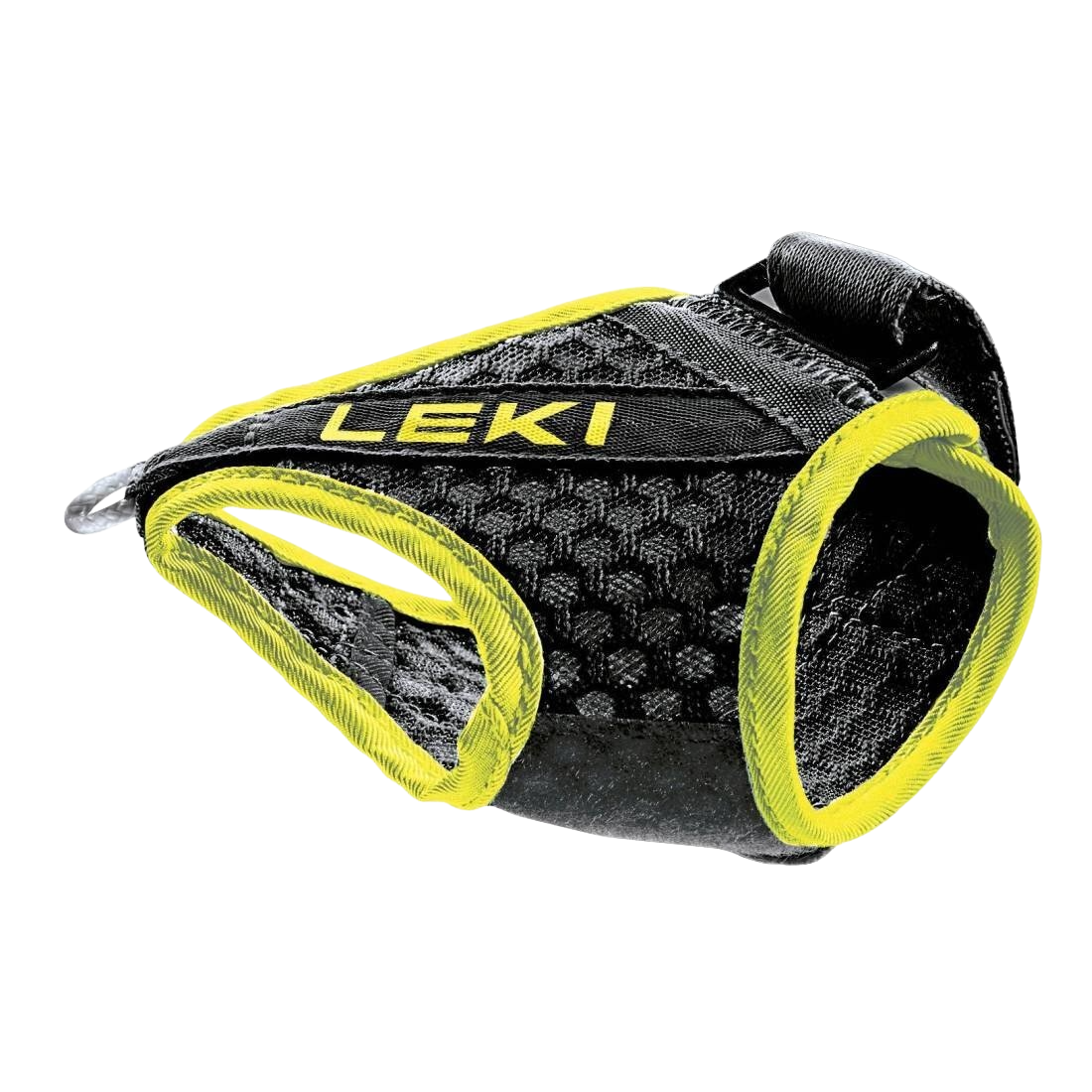 Die Leki Trigger Shark Frame Strap Mesh von Leki sind Daumenschlaufen die den Anschub unterstützen. Die Schlaufe ist aus einem Stück gefertigt und umschließt die Hand komplett, störende Materialüberlappungen sind ausgeschlossen, was Blasen oder Druckstellen verhindert. Der anatomisch perfektionierte Schnitt und das atmungsaktive Mesh-Material mit der breiten Auflagefläche lässt die Schlaufe sicher und geschmeidig an der Hand anliegen. Der direkte Kontakt zum Griff sorgt dafür, dass jeder Impuls ohne Kraftverlust an den Stock übertragen wird. Mit dem Trigger Shark 2.0 System kann man sich blitzschnell in den Stockgriff ein- oder ausklinken und die Weite ist stufenlos einstellbar. Material 100% Polyester Farbe: black-neonyellow