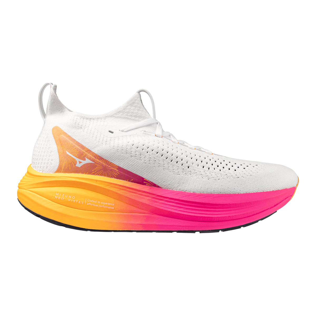 Mizuno Neo Vista 2 – Unisex Der Mizuno Neo Vista 2 wurde für alle Läufer:innen entwickelt, die beim Training keine Kompromisse eingehen wollen. Als High-Performance-Supertrainer kombiniert er federnde Dämpfung, Stabilität und Effizienz in einem dynamischen Design. Das Herzstück des Schuhs ist die zweischichtige Zwischensohle: Oben sorgt mit Stickstoff angereicherter MIZUNO ENERZY NXT für ein besonders weiches, reaktives Laufgefühl, während die EVA-basierte Unterschicht Stabilität verleiht – ideal für lange Läufe und intensive Einheiten. Dank Smooth Speed Assist profitierst du von einer effizienteren Laufökonomie, die sich besonders auf längeren Distanzen bezahlt macht. Die integrierte Mizuno Wave Plate unterstützt den natürlichen Bewegungsablauf und sorgt für zusätzlichen Vortrieb. Mit dem breiten Sohlenaufbau erlebst du ein stabiles und gleichzeitig dynamisches Laufgefühl. Die nachhaltige Materialauswahl – darunter ein Obermaterial mit 70 % Recyclinganteil – rundet das Konzept ab. Der Neo Vista 2 ist die ideale Wahl für Läufer:innen, die zwischen Trainings- und Wettkampfschuhen wechseln wollen, um ihre Performance gezielt zu steigern. Technische Details: Zwischensohle: MIZUNO ENERZY NXT (oben, Stickstoff-injiziert) + EVA-basiert (unten) Smooth Speed Assist für effiziente Laufökonomie Mizuno Wave Plate für Stabilität und Vortrieb Nachhaltige Materialien (u.a. BLOOM™ in der Außensohle) Sprengung: 8 mm (44,5 mm Ferse / 36,5 mm Vorfuß) Gewicht: 265 g Dieser Supertrainer bringt Struktur in dein Lauftraining und bietet dir eine perfekte Balance aus Stabilität, Komfort und Speed.
