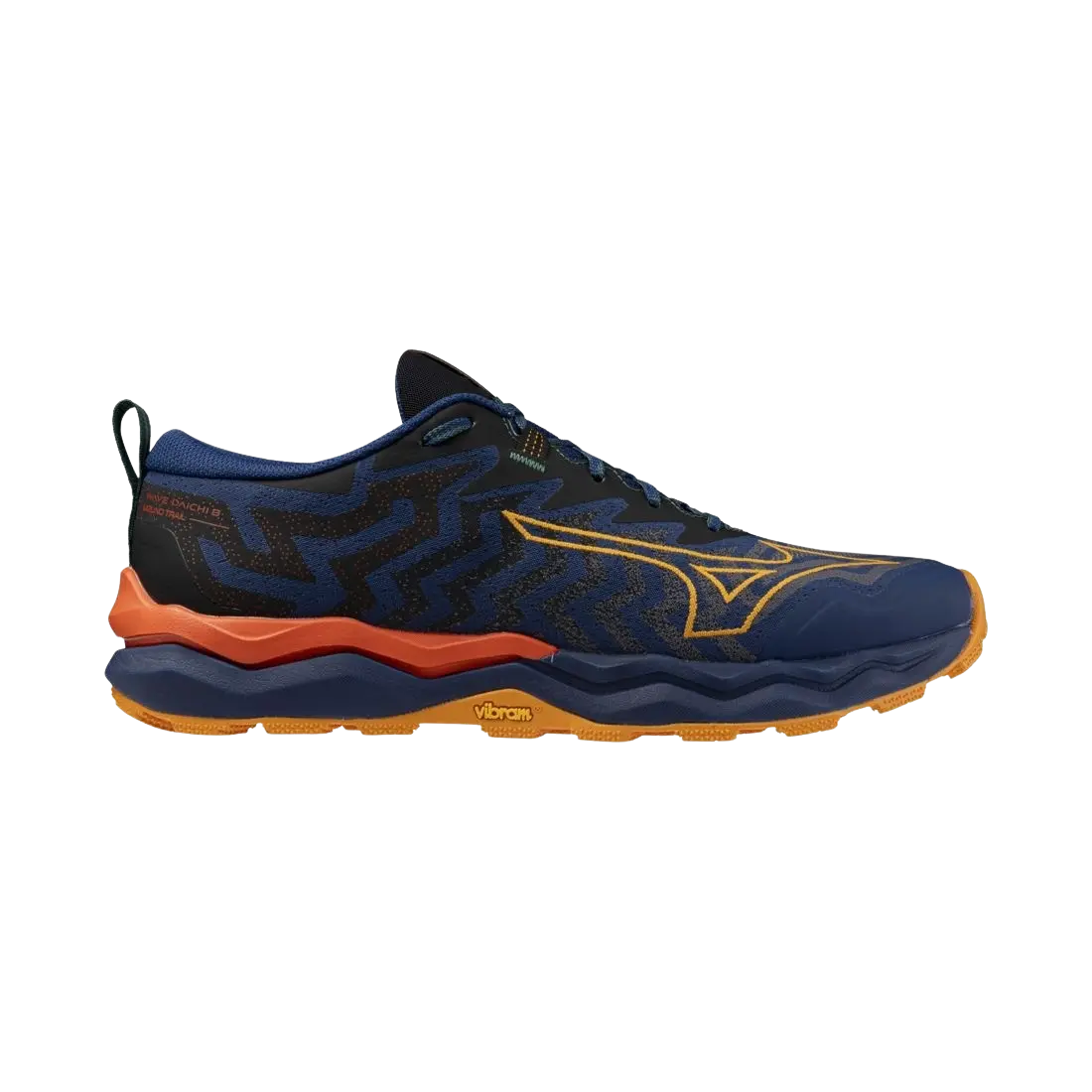 Mizuno WAVE DAICHI 8 – Der endlose Entdecker Der Mizuno WAVE DAICHI 8 ist ein vielseitiger Trailrunning-Schuh, der für alle Läufertypen, Laufuntergründe und Distanzen geeignet ist. Er bietet alles, was man für das Laufen auf Trails benötigt: Dämpfung, Stabilität, Leichtigkeit und Grip. Zu den Hauptmerkmalen gehören das MIZUNO ENERZY FOAM in der gesamten Zwischensohle für Dämpfung und Energierückgabe, MIZUNO FOAM WAVE für Stabilität ohne Einbußen bei der Dämpfung und Vibram Megagrip für hervorragenden Halt selbst auf nassen und unebenen Oberflächen. Dieser Schuh ermöglicht es, Trails in vollen Zügen zu genießen, da er alle Anforderungen abdeckt und gleichzeitig das weiche Gefühl und die Passform eines Straßenlaufschuhs bietet. Technische Details des Mizuno WAVE DAICHI 8 Trailschuhs: MIZUNO ENERZY FOAM: Bietet unglaubliche Dämpfung und Energierückgabe. MIZUNO FOAM WAVE: Verbessert die Stabilität ohne Einbußen bei der Dämpfung. Rock Plate: Die EVA-Platte im Vorfußbereich absorbiert Stöße und schützt vor Felsen. Vibram Megagrip: Vibrams führende Hochleistungsmischung bietet herausragenden Grip, insbesondere auf nassen und unebenen Flächen. Nachhaltigkeit: Futter des Obermaterials: Mehr als 90% recycelter Inhalt. Schnürsenkel: Mehr als 90% recycelter Inhalt. Zwischensohle: Teilweise aus zuckerrohrbasiertem Material hergestellt. Gewicht: 300g Sprengung: 6mm Farbe: Estate Blue / Apricot / Spicy Orange