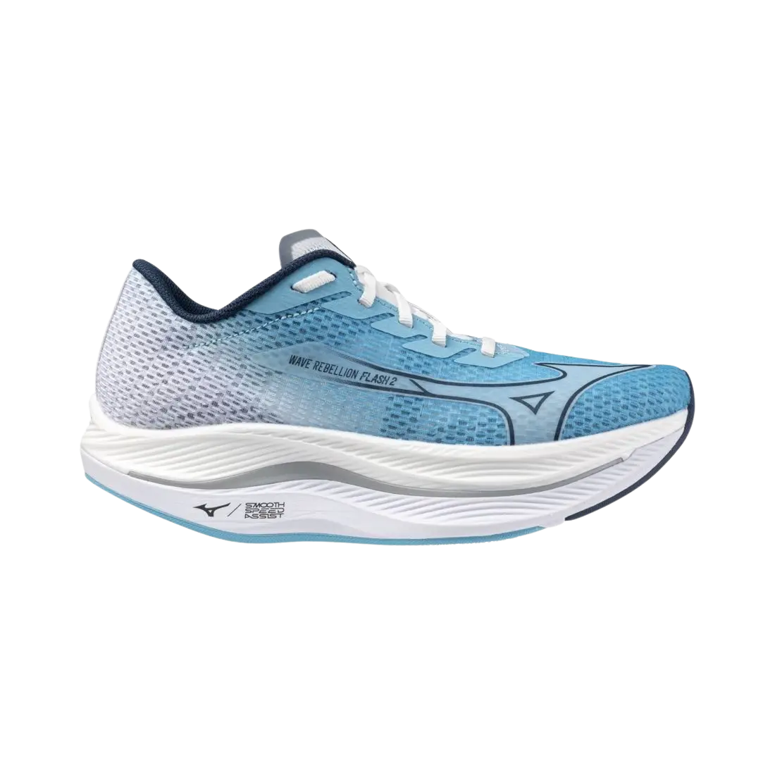 Mizuno WAVE REBELLION FLASH 2 – Eine neue Generation der Geschwindigkeit für erfahrene Läufer Der Wave Rebellion Flash 2 ist perfekt für Läufer, die schnelle Sprints in ihre Läufe integrieren möchten, egal ob sie für Wettkämpfe trainieren oder persönliche Bestzeiten setzen wollen. Dieser Schuh ist vollgepackt mit Funktionen, die das schnelle Laufen unterstützen, einschließlich des SMOOTH SPEED ASSIST. Das MIZUNO ENERZY LITE+ Material in der oberen Zwischensohle bietet verbesserte Weichheit bei geringem Gewicht, während das MIZUNO ENERZY FOAM in der unteren Zwischensohle Dämpfung und Energierückgabe gewährleistet. Erlebe einen komfortablen „Speed Day“ mit diesem Schuh, der dir hilft, in deinem eigenen gleichmäßigen Rhythmus zu laufen, geschmeidig und mit deiner bevorzugten Geschwindigkeit, ohne dabei auf Komfort zu verzichten. Technische Details des Mizuno WAVE REBELLION FLASH 2: SMOOTH SPEED ASSIST: Unterstützt Läufer dabei, die von Mizuno als ideal erachtete Laufbewegung zu nutzen. MIZUNO ENERZY LITE+ (oben) & ENERZY (unten): Die Kombination dieser beiden Zwischensohlenmaterialien bietet ein weiches und reaktionsschnelles Laufgefühl, das schnelles Laufen unterstützt. MIZUNO WAVE: Verbessert die Stabilität beim schnellen Laufen, ohne auf Weichheit zu verzichten. Die Platte, die bis zum Vorfuß reicht, unterstützt ebenfalls die Effekte des SMOOTH SPEED ASSIST. Nachhaltigkeit: Futter des Obermaterials: Mehr als 90% recycelter Inhalt. Einlegesohle: Mehr als 90% recycelter Inhalt. Wave Plate: Hergestellt aus pflanzenbasiertem Rilsan®. Gewicht: 205g Sprengung: 0,5mm Farbe: River Blue / Blue Wing Teal / White
