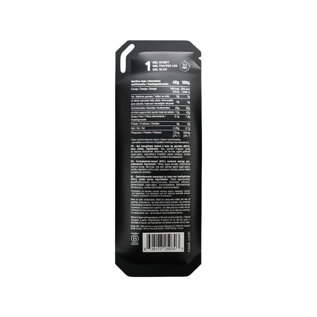 Näak Boost Energy™ Gel 25 – Nachhaltige Energie für maximale Leistung Das Näak Boost Energy™ Gel ist dein verlässlicher Energie-Booster für intensive Trainings und Wettkämpfe. Mit 25 g Kohlenhydraten pro Portion liefert es dir schnell verfügbare und langanhaltende Energie – optimal abgestimmt im 2:1-Verhältnis aus Glukose und Fruktose für maximale Aufnahme bei minimalem Magenstress. Zusätzlich versorgt dich das Gel mit 185 mg Elektrolyten, um Natrium und Kaliumverluste durch Schweiß auszugleichen. Die samtige Jelly-Textur lässt sich auch bei hoher Belastung leicht schlucken, während der dezent süße Geschmack für angenehme Abwechslung sorgt – ganz ohne künstliche Zusätze. Hergestellt aus rein natürlichen, pflanzlichen und umweltschonenden Zutaten wie Agavensirup, Tapioka und Agar-Agar steht dieses Gel für leistungsorientierte, aber bewusste Sporternährung. Deine Vorteile im Überblick: 25 g Kohlenhydrate für schnelle und anhaltende Energiezufuhr 2:1 Glukose-Fruktose-Verhältnis für optimale Aufnahme 185 mg Elektrolyte (Natrium + Kalium) für verbesserte Hydration 100 % natürlich, vegan und ohne künstliche Aromen Jelly-Textur für gute Verträglichkeit und leichtes Schlucken Umweltfreundliche Rezeptur aus ressourcenschonenden Zutaten Pro verkaufter Box wird Meeresalge (Kelp) gepflanzt – für mehr CO2-Bindung Technische Details: Inhalt: 1 Gel = 25 g Kohlenhydrate Textur: Jelly, leicht verdaulich Geschmack: natürlich süß, ohne künstliche Süßstoffe Vegan, gelatinfrei, ohne künstliche Aromen Zutaten: Agavenpulver, Tapiokasirup, Dextrose, Meersalz, Kaliumcitrat, Agar-Agar, Zitronensäure, Kaliumsorbat Erhältlich einzeln oder als Box mit 12 Gels – für nachhaltige Performance auf jedem Kilometer.