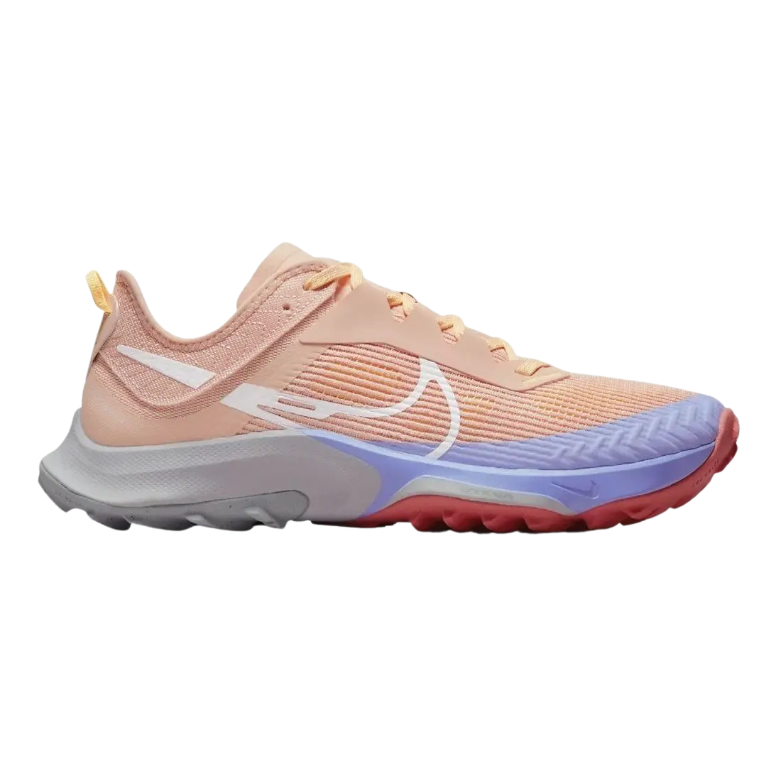 Der Nike Air Zoom Terra Kiger 8 Lauftschuh Damen sorgt für ein leichtes, eng anliegendes Tragegefühl. Es ist ein schnörkelloser Schuh, der nur mit dem, was du brauchst, entwickelt wurde, um eine sichere Passform und ein optimales Tragegefühl zu gewährleisten. Wir haben ihn für eine rutschfeste Passform entwickelt, damit du auf unebenem Terrain wendig und aufrecht bleibst. Außerdem hat er eine weiche Dämpfung und ein reaktionsfreudiges Tragegefühl, das dir bei jedem Schritt etwas mehr Federung gibt. Also zieh ihn an und mach dich bereit für Läufe im Schlamm und auf dem Trail. Weitere Details zum Nike Air Zoom Terra Kiger 8 Laufschuh für Damen: Weniger Schmutz, bessere Kühlung – Das leichte, atmungsaktive Mesh im Obermaterial sorgt für ein kühles, sicheres Tragegefühl. Es ist durchgehend gefüttert, um das Eindringen von Schmutz zu gewährleisten. Anziehen und loslegen – Die Ferse sorgt für einen rutschfesten Halt, hält den Fuß in Position und folgt den Bewegungen des Schuhs. Das Ergebnis ist mehr Beweglichkeit auf felsigem Gelände. Griffige Traktion – Die multidirektionalen Traktionsstollen an der Ferse bestehen aus besonders abriebfestem Gummi. Sie sorgen für mehr Grip bei Steigungen und Gefällen. Weich und federnd – Die Nike React-Technologie sorgt mit leichtem, strapazierfähigem Schaumstoff für ein reaktionsfreudiges Laufgefühl. Ein Zoom Air-Element im Vorfuß sorgt für zusätzliche Reaktionsfähigkeit und gibt dir auf dem Trail Energie zurück. Weitere Vorteile Die Fels-Platte schützt deine Füße in rauem Gelände. Überzüge im Zehenbereich verbessern die Abriebfestigkeit. Die gepolsterte Zunge reduziert den Druck, der durch das Anschwellen des Fußes bei langen Läufen entsteht. Gezeigte Farbe: Arctic Orange/Melon Tint/Purple Pulse/Weiß Style: DH0654-800 Sprengung: 6mm (30mm Ferse – 24mm Vorfuß) Gewicht: 255 Gramm Farbe: arctic