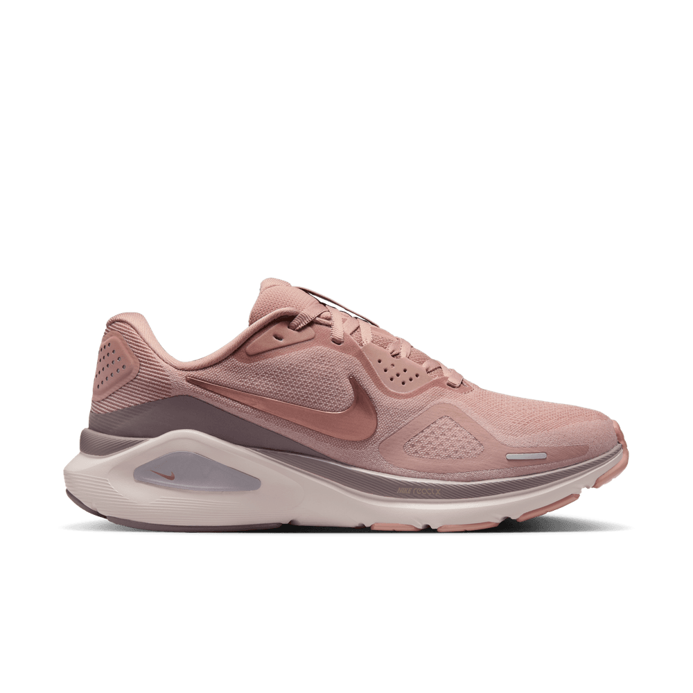Nike Zoom Structure 26 – Stabilität und Komfort für Läuferinnen Der Nike Zoom Structure 26 wurde speziell für Läuferinnen entwickelt, die Wert auf zuverlässige Stabilität und angenehme Dämpfung legen. Mit seiner durchgehenden ReactX-Mittelsohle bietet der Schuh ein geschmeidiges, gedämpftes Abrollverhalten – und das mit 13?% mehr Energierückgabe als sein Vorgänger. Die Sohlenkonstruktion stützt gezielt das Fußgewölbe und sorgt so für ein stabiles Laufgefühl, das dich bei täglichen Trainingseinheiten optimal unterstützt. Das bewährte Stabilitätssystem im Mittelfußbereich reduziert das ungewollte Einknicken nach außen und führt den Fuß kontrolliert von der Ferse bis zu den Zehen. Das speziell entwickelte Mesh-Obermaterial schmiegt sich angenehm an und wird durch die weiche Polsterung an Kragen und Zunge ergänzt. Ein flexibles Gummi im Vorfußbereich erhöht den Laufkomfort, während abriebfestes Gummi an der Ferse für Langlebigkeit sorgt. Deine Vorteile im Überblick: ReactX-Mittelsohle für weiche Dämpfung und verbesserte Energierückgabe Stützendes Design im Mittelfußbereich für mehr Kontrolle beim Abrollen Atmungsaktives, komfortables Mesh-Obermaterial mit weicher Polsterung Robuste Außensohle mit langlebigem Gummi an stark beanspruchten Zonen Reflektierende Elemente für mehr Sichtbarkeit bei Dunkelheit Technische Details: Gewicht: ca. 262 g Sprengung: 10 mm Mittelsohle: ReactX-Schaumstoff Außensohle: Flexibles Gummi mit abriebfestem Fersenbereich Obermaterial: Speziell entwickeltes Mesh Ein zuverlässiger Stabilschuh für Läuferinnen, die Komfort und Halt bei jeder Laufeinheit in Einklang bringen möchten.