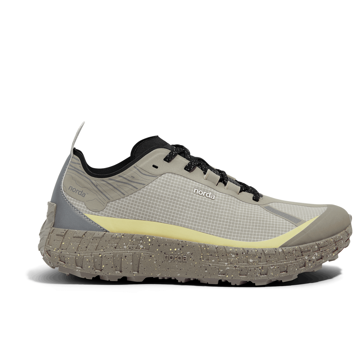 norda 001A Damen – ultraleicht, robust & für lange Distanzen Der norda 001A Damen wurde für Läuferinnen entwickelt, die höchste Performance und Komfort auf ultralangen Distanzen suchen. Mit seinem nahtlosen Dyneema®-Obermaterial bietet er außergewöhnliche Strapazierfähigkeit und gleichzeitig ein minimales Gewicht. Die exklusive norda™ x Vibram® Sohle mit Litebase® und Megagrip® liefert zuverlässigen Halt auf jedem Terrain, während die 5 mm Stollen optimalen Grip garantieren. Die Arnitel® TPEE-Mittelsohle sorgt für langlebige Dämpfung, Energierückgabe und Widerstandsfähigkeit, unterstützt durch eine individuell designte eTPU-Einlegesohle für maximale Energieabsorption. Reflektierende Elemente rundum erhöhen deine Sichtbarkeit bei Dunkelheit. Nachhaltig gefertigt aus biobasierten und recycelten Materialien, kombiniert der 001A Spitzenperformance mit einem leichten ökologischen Fußabdruck. Highlights im Überblick Dyneema® Obermaterial: nahtlos, extrem strapazierfähig & leicht. Arnitel® TPEE Mittelsohle: langlebige Dämpfung & Energierückgabe. Vibram® Litebase® + Megagrip®: exklusive Sohle mit 5 mm Stollen für maximalen Grip. norda™ Lock System: sockenähnliche Passform für optimalen Halt. 360° Reflektoren: bessere Sichtbarkeit von allen Seiten. Nachhaltig: biobasierte & recycelte Materialien. Technische Details Gewicht: 232 g (US 8, inkl. eTPU-Innensohle) Sprengung: 5 mm Stack Height: Ferse 26 mm / Vorfuß 21 mm Laufsohle: Vibram® Litebase® + Megagrip®, 5 mm Stollen Der norda 001A Damen vereint Leichtigkeit, Haltbarkeit und Komfort – ein Trailschuh der Spitzenklasse für höchste Ansprüche und lange Distanzen.