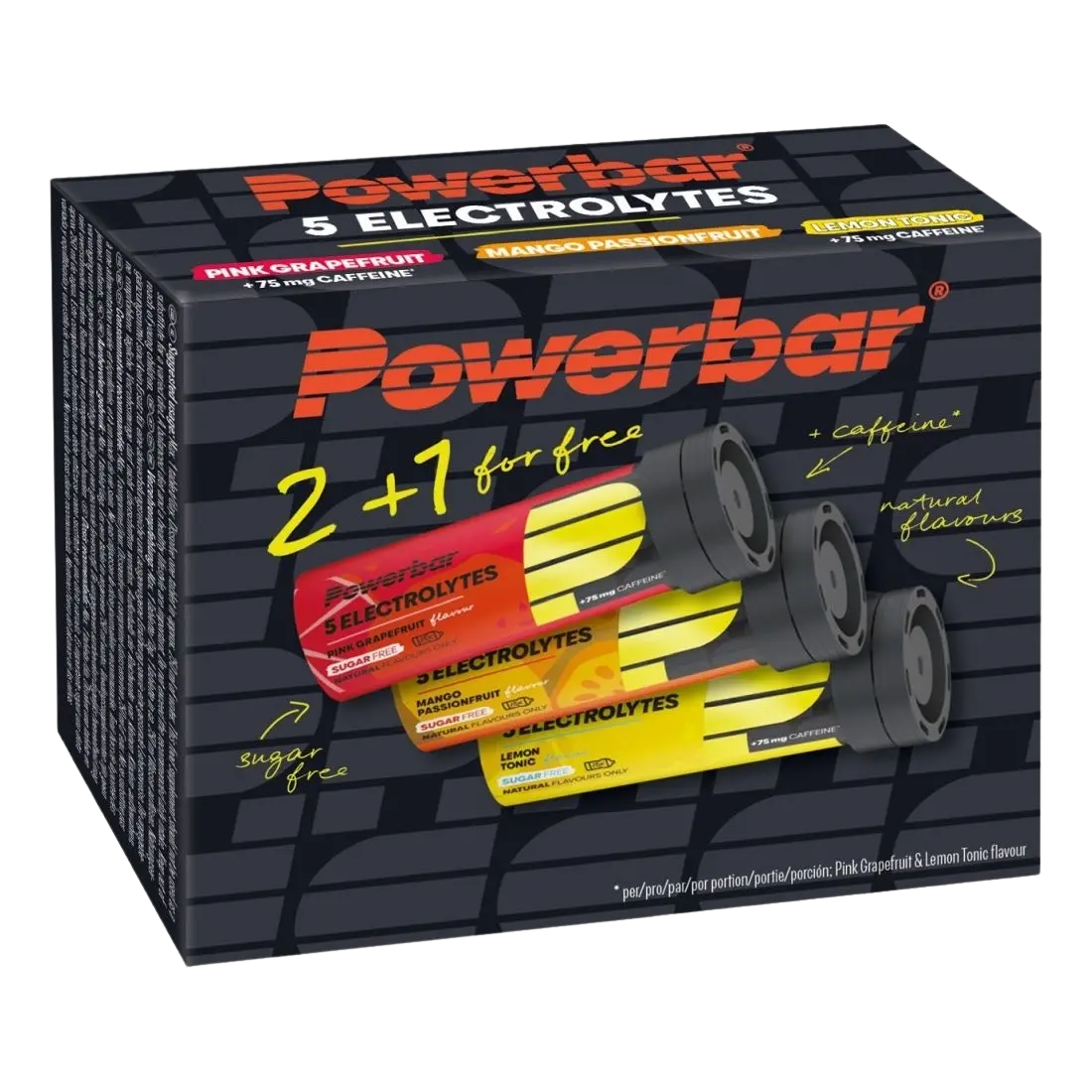 PowerBar 5 Electrolytes 2+1 gratis – Multiflavour Vorteilspack. 5 Elektrolyte. 0 Zucker. 0 Kalorien. 100% Erfrischung. Bei ausgewählten Trainings möchtest du nur Wasser trinken, um so keine Kalorien oder Kohlenhydrate zu dir zu nehmen oder auch den Fettstoffwechsel zu optimieren. Während des Sports verlierst du jedoch über den Schweiß auch Elektrolyte, die zahlreiche, wichtige Funktionen im Körper erfüllen. Genau hier setzen die PowerBar 5Electrolytes Brausetabletten an. Sie ergeben ein hochwertiges, kalorienfreies Sportgetränk mit den 5 Elektrolyten, die du mengenmäßig am meisten über den Schweiß verlierst – ideal für Grundlagenausdauertraining und wann immer du Sport treibst, aber keine Kalorien oder Zucker zu dir nehmen willst. Nahrungsergänzungsmittel Brausetablette zur Herstellung eines kalorienfreien Erfrischungsgetränkes mit 5 Mineralstoffen und Süßungsmittel. 3 Geschmacksrichtungen. 3 Röhrchen mit je 10 Tabletten 5 Electrolytes liefert dem Körper die 5 Hauptelektrolyte (Natrium, Chlorid, Kalium, Magnesium und Calcium) im Verhältnis wie man sie durch Schweiß verliert Null Zucker – Null Kalorien Erfrischend, fruchtiger Geschmack durch natürliche Aromen Frei von Aspartam und Konservierungsstoffen 10 Tabletten ergeben je nach gewünschter Geschmackintensität bis zu 7,5 Liter Fertiggetränk Geschmacksrichtungen: Mango, Grapefruit, Lemon So verwendest du das Produkt: Allgemeine Flüssigkeitszufuhrempfehlung für Aktivitäten >60 Minuten: Zubereitung: 1 Tablette je nach Geschmackspräferenz in 500 bis 750 ml Wasser auflösen Ca. 200 – 300ml in der Stunde vor dem Sport trinken Während des Sports alle 15 Minuten ca. 150 – 200ml trinken 1-4 Tabletten (für koffeinfreie Geschmacksrichtungen) bzw. 1-2 Tabletten (für Geschmacksrichtungen mit Koffein) pro Tag Dieses Nahrungsergänzungsmittel sollte nicht als Ersatz für eine abwechslungsreiche Ernährung verwendet werden. Die empfohlene Verzehrmenge darf nicht überschritten werden. Außerhalb der Reichweite von kleinen Kindern lagern. Für koffeinhaltige Geschmacksrichtungen: Enthält Koffein. Für Kinder und schwangere Frauen nicht empfohlen. Inhalt: 3 x 42g á 10 Tabs Zutaten: Säuerungsmittel (Citronensäure), Säureregulator (Natriumcarbonate), Mineralstoffe (14,7%) (Kaliumchlorid, Calciumcarbonat, Natriumchlorid, Magnesiumhydroxid, Calciumphosphate), Feuchthaltemittel (Sorbit), Inulin, natürliche Aromen, Stärke, Maltodextrin, Süßungsmittel (Sucralose), Rote-Bete-Saftpulver, Farbstoff (Lutein). Nährwertkennzeichnung: pro 100 g pro Tablette (4,2 g) pro 4 Tabletten (4 x 4,2 g) Energie kJ (kcal) 810 (194) 34 (8) 137 (33) Fett 0 g 0 g 0 g davon gesättigte Fettsäuren 0 g 0 g 0 g Kohlenhydrate 13,8 g 0,6 g 2,4 g davon Zucker 1,1 g 0 g 0,2 g Eiweiß 0,1 g 0 g 0 g Salz 15,0 g 0,63 g 2,52 g Mineralstoffe: pro 100 g pro Tablette (4,2 g) pro 4 Tabletten (4 x 4,2 g) Natrium 5952 mg 250 mg 1000 mg Kalium 3571 mg 150 mg (7,5%*) 600 mg (30%*) Chlorid 4762 mg 200 mg (25%*) 800 mg (100%*) Calcium 1429 mg 60 mg (7,5%*) 240 mg (30%*) Magnesium 670 mg 28,1 mg (7,5%*) 113 mg (30%*)