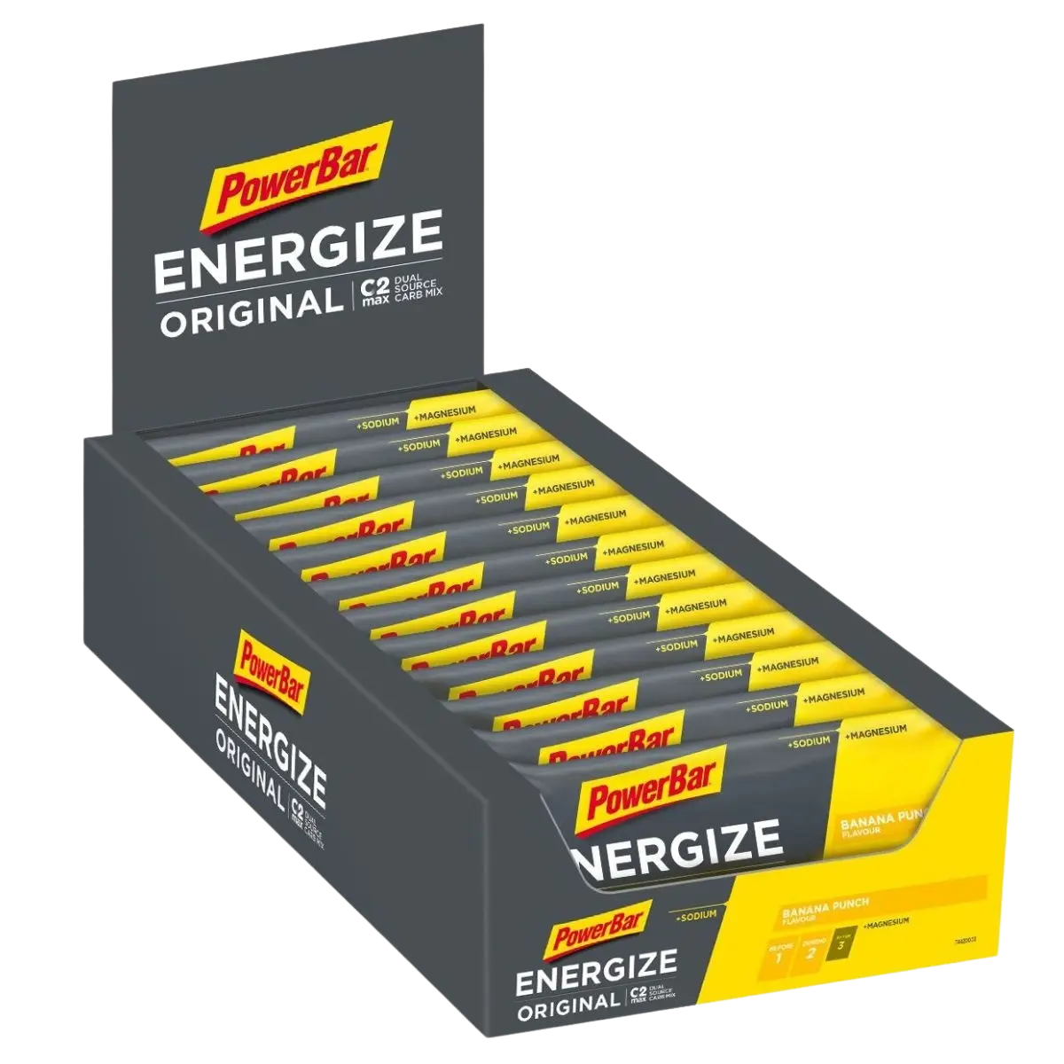 Powerbar ENERGIZE RIEGEL ORIGINAL – BANANA PUNCH – Ideal vor und/oder während der Belastung, dazu ausreichend Flüssigkeit. Damit du im intensiven Training und im Wettkampf alles geben kannst, sollten deine Energiespeicher nicht nur vor dem Sport aufgefüllt sein, sondern auch währenddessen solltest du deinem Körper regelmäßig Kohlenhydrate zuführen. PowerBar hat schon im Jahr 1986 den weltweit ersten Kohlenhydratriegel entwickelt. Der Energize Original Riegel ist ein idealer Kohlenhydratlieferant in fester Form, aber trotzdem leicht zu kauen. Mit C2MAX liefert er dir eine wissenschaftlich entwickelte Kohlenhydratmischung mit einem 2:1 Verhältnis aus Glukose- und Fruktosequellen, sowie zur Unterstützung des Mineralienhaushalts Natrium und Magnesium. Bewährte Funktionalität mit C2MAX Dual Source Carb Mix Mit extra Natrium, das durch Schweiß mengenmäßig am meisten verlorene Elektrolyt Mit extra Magnesium, zur Unterstützung des normalen Energiestoffwechsels Frei von Farbstoffen und Konservierungsstoffen (lt. Gesetz) Für Vegetarier geeignet Gute Verträglichkeit Alle PowerBar Produkte (ausgenommen: Electrolyte Drink Konzentrate) sind auf der Kölner Liste® aufgeführt, dadurch bieten wir den Athleten noch mehr Sicherheit und Vertrauen. Geschmacksrichtung: Banana Punch Inhalt: 1 Box à 15 Riegel zu je 55g