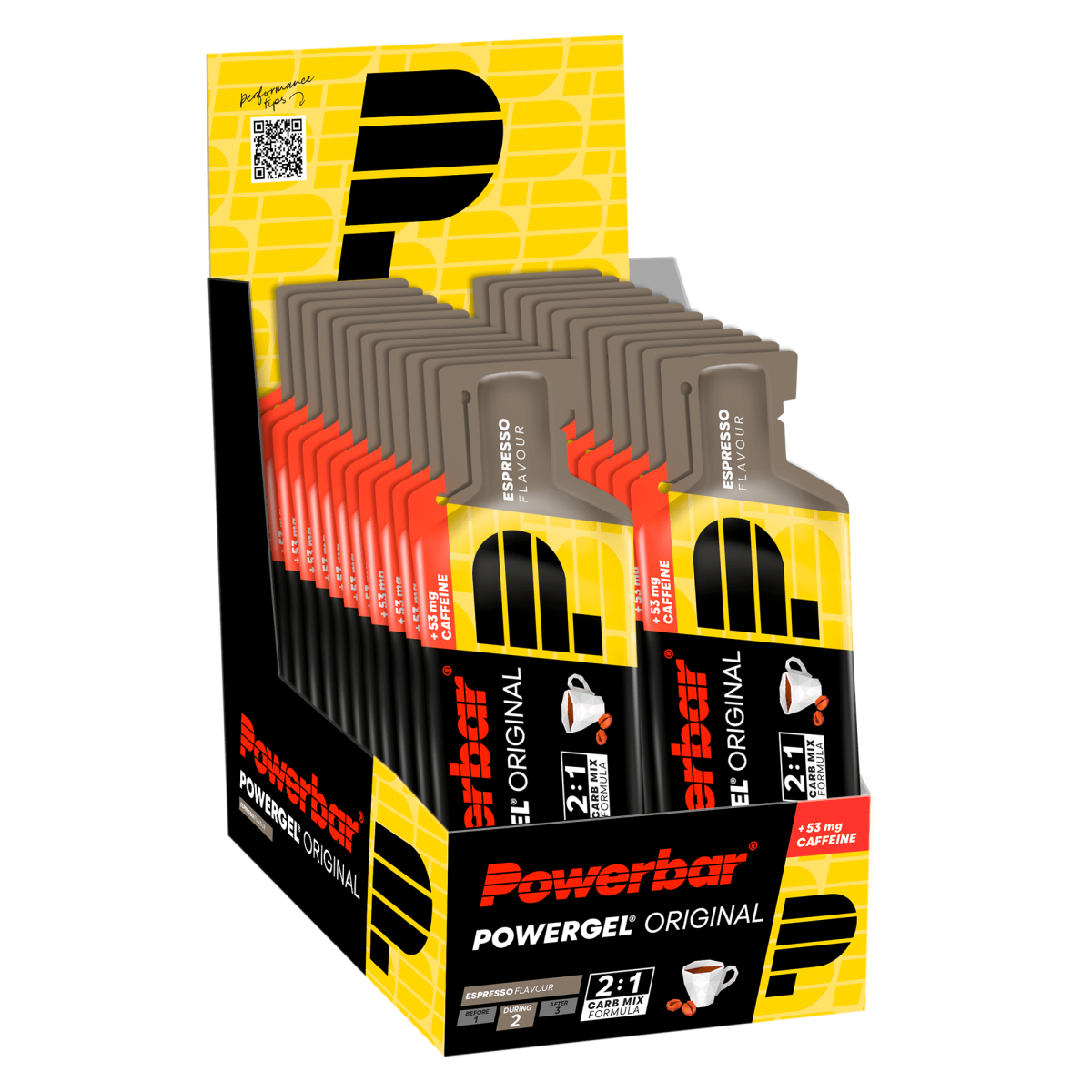 Du bist auf der Suche nach bewährten Kohlenhydrat-Gelen, auf die auch Profis unterschiedlicher Sportarten schon seit 1996 vertrauen? Dann sollte deine Wahl auf PowerBar PowerGel® Original fallen. Das Original der PowerGele® versorgt dich mit C2MAX in Kombination mit Natrium. C2MAX ist ein Kohlenhydratmix, welcher ein wissenschaftlich entwickeltes 2:1 Verhältnis von Glukose- und Fruktosequellen enthält. Bewährte Funktionalität mit C2MAX Dual Source Carb Mix und ca. 200 mg Natrium pro Beutel Vegan Innovative Verpackung: leicht zu öffnen und verhindert zusätzlichen Abfall durch „Trash Chain“ Geschmacksrichtungen Black Currant und Green Apple: enthalten zusätzlich 50 mg Koffein proBeutel Geschmacksrichtungen Espresso: enthält zusätzlich 53 mg Koffein pro Beutel Geschmacksrichtung Salty Peanut: auch für Erdnussallergiker geeignet Alle PowerBar Produkte (ausgenommen: Electrolyte Drink Konzentrate) sind auf der Kölner Liste® aufgeführt, dadurch bieten wir den Athleten noch mehr Sicherheit und Vertrauen. Inhalt: 41g (pro Einzel VE!) Verzehrempfehlung: Geschmacksrichtung ohne Koffein: 1-4 Beutel/ Tag. Geschmacksrichtung mit Koffein: 1-3 Beutel/ Tag. Nimm nach Bedarf einen Beutel mit Wasser in regelmäßigen Abständen während der Belastung. Geschmacksrichtung mit Koffein: Erhöhter Koffeingehalt. Für Kinder und schwangere oder stillende Frauen nicht empfohlen. (Green Apple & Black Currant: 122 mg/100g; 50 mg/ Beutel. Espresso: 130 mg/100g; 53 mg/ Beutel.)