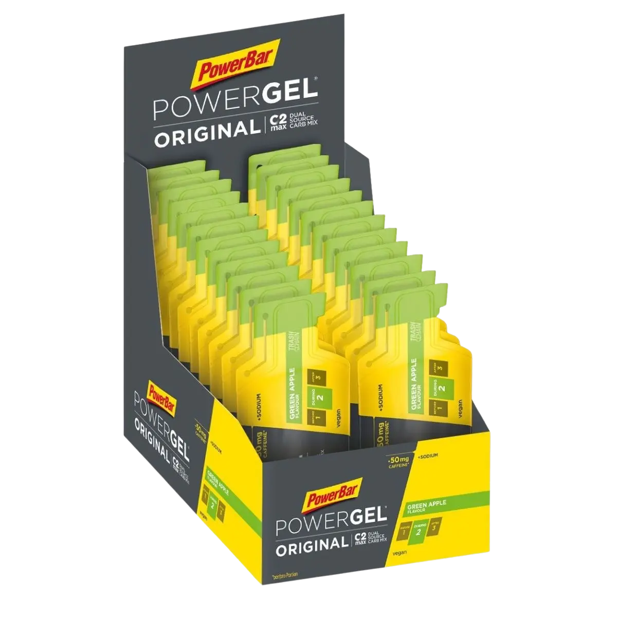 Du bist auf der Suche nach bewährten Kohlenhydrat-Gelen, auf die auch Profis unterschiedlicher Sportarten schon seit 1996 vertrauen? Dann sollte deine Wahl auf PowerBar PowerGel® Original fallen. Das Original der PowerGele® versorgt dich mit C2MAX in Kombination mit Natrium. C2MAX ist ein Kohlenhydratmix, welcher ein wissenschaftlich entwickeltes 2:1 Verhältnis von Glukose- und Fruktosequellen enthält. Bewährte Funktionalität mit C2MAX Dual Source Carb Mix und ca. 200 mg Natrium pro Beutel Vegan Innovative Verpackung: leicht zu öffnen und verhindert zusätzlichen Abfall durch „Trash Chain“ Geschmacksrichtungen Black Currant und Green Apple: enthalten zusätzlich 50 mg Koffein proBeutel Geschmacksrichtungen Espresso: enthält zusätzlich 53 mg Koffein pro Beutel Geschmacksrichtung Salty Peanut: auch für Erdnussallergiker geeignet Alle PowerBar Produkte (ausgenommen: Electrolyte Drink Konzentrate) sind auf der Kölner Liste® aufgeführt, dadurch bieten wir den Athleten noch mehr Sicherheit und Vertrauen. Inhalt: 41g (pro Einzel VE!) Verzehrempfehlung: Geschmacksrichtung ohne Koffein: 1-4 Beutel/ Tag. Geschmacksrichtung mit Koffein: 1-3 Beutel/ Tag. Nimm nach Bedarf einen Beutel mit Wasser in regelmäßigen Abständen während der Belastung. Geschmacksrichtung mit Koffein: Erhöhter Koffeingehalt. Für Kinder und schwangere oder stillende Frauen nicht empfohlen. (Green Apple & Black Currant: 122 mg/100g; 50 mg/ Beutel. Espresso: 130 mg/100g; 53 mg/ Beutel.)