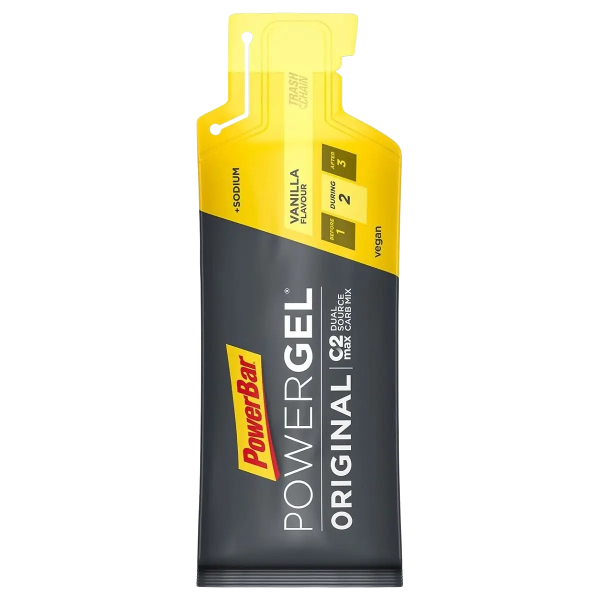 Du bist auf der Suche nach bewährten Kohlenhydrat-Gelen, auf die auch Profis unterschiedlicher Sportarten schon seit 1996 vertrauen? Dann sollte deine Wahl auf PowerBar PowerGel® Original fallen. Das Original der PowerGele® versorgt dich mit C2MAX in Kombination mit Natrium. C2MAX ist ein Kohlenhydratmix, welcher ein wissenschaftlich entwickeltes 2:1 Verhältnis von Glukose- und Fruktosequellen enthält. Bewährte Funktionalität mit C2MAX Dual Source Carb Mix und ca. 200 mg Natrium pro Beutel Vegan Innovative Verpackung: leicht zu öffnen und verhindert zusätzlichen Abfall durch „Trash Chain“ Geschmacksrichtungen Black Currant und Green Apple: enthalten zusätzlich 50 mg Koffein proBeutel Geschmacksrichtungen Espresso: enthält zusätzlich 53 mg Koffein pro Beutel Geschmacksrichtung Salty Peanut: auch für Erdnussallergiker geeignet Alle PowerBar Produkte (ausgenommen: Electrolyte Drink Konzentrate) sind auf der Kölner Liste® aufgeführt, dadurch bieten wir den Athleten noch mehr Sicherheit und Vertrauen. Inhalt: 41g (pro Einzel VE!) Verzehrempfehlung: Geschmacksrichtung ohne Koffein: 1-4 Beutel/ Tag. Geschmacksrichtung mit Koffein: 1-3 Beutel/ Tag. Nimm nach Bedarf einen Beutel mit Wasser in regelmäßigen Abständen während der Belastung. Geschmacksrichtung mit Koffein: Erhöhter Koffeingehalt. Für Kinder und schwangere oder stillende Frauen nicht empfohlen. (Green Apple & Black Currant: 122 mg/100g; 50 mg/ Beutel. Espresso: 130 mg/100g; 53 mg/ Beutel.)