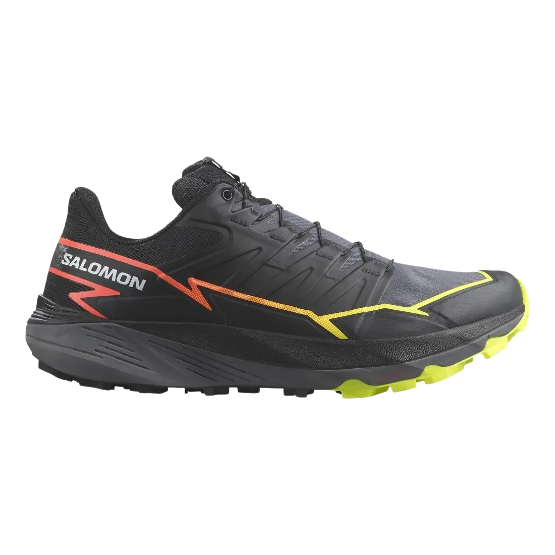 Der Salomon THUNDERCROSS Herren Trailschuh steht für dynamische Dämpfung und kompromisslosen Grip. Der Thundercross ist ein Trailrunningschuh für ein dynamisches, gedämpftes Laufgefühl mit hervorragendem Grip und präzisem Halt. Ausgestattet mit aggressiven 5 mm Stollen für jedes Gelände, egal wie schwierig, technisch oder schmutzig. In den französischen Alpen entwickelt und auf allen Untergründen getestet, von rollenden Hügeln über steinige Pisten bis hin zu Strecken mit gutem Grip. Laufleistung Eine elastische und bequeme Zwischensohle sorgt für einen kraftvollen Abstoß und eine weiche Landung und damit für ein angenehmes Laufgefühl. Grip Aggressive, tiefe 5 mm Stollen bieten hervorragenden Grip und Traktion auf allen technischen Untergründen und Oberflächen. Passform Inspiriert von den besten Trailrunning-Passformen, mit Sensifit™-Konstruktion für präzisen, optimalen Halt am Fuß und zuverlässigen, weichen Komfort. Weitere Details zum Salomon THUNDERCROSS Laufschuh für Herren: All Terrain Contagrip® – Unsere All Terrain Contagrip® Sohle ist für eine Vielzahl unterschiedlicher Untergründe ausgelegt. Sie bietet Haltbarkeit und Trittsicherheit auf nassen, trockenen und harten Oberflächen. Chevron-Stollen – Stollendesign, das sich tief in den Untergrund gräbt und multidirektionalen Grip bietet. Verbessert die Traktion auf weichem Untergrund wie Schlamm oder lockerem Geröll. Energy Foam – Leichter, reaktiver Schaumstoff aus EVA und Olefin (OBC) für dauerhafte Dämpfung und Energierückgabe. ME:sh®-Einsatz für Geröllschutz Quicklace™ Schnürsystem Recyceltes Material Gewicht: 290 g Sprengung: 4 mm