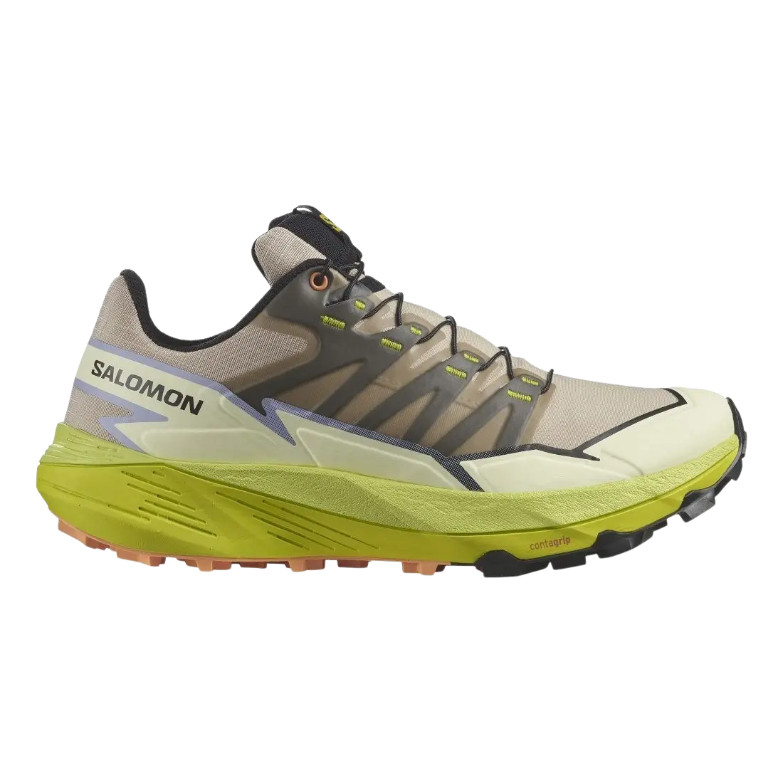 Der Salomon THUNDERCROSS Laufschuh Damen steht für dynamische Dämpfung und kompromisslosen Grip. Der Thundercross ist ein Trailrunningschuh für ein dynamisches, gedämpftes Laufgefühl mit hervorragendem Grip und präzisem Halt. Ausgestattet mit aggressiven 5 mm Stollen für jedes Gelände, egal wie schwierig, technisch oder schmutzig. In den französischen Alpen entwickelt und auf allen Untergründen getestet, von rollenden Hügeln über steinige Pisten bis hin zu Strecken mit gutem Grip. Laufleistung Eine elastische und bequeme Zwischensohle sorgt für einen kraftvollen Abstoß und eine weiche Landung und damit für ein angenehmes Laufgefühl. Grip Aggressive, tiefe 5 mm Stollen bieten hervorragenden Grip und Traktion auf allen technischen Untergründen und Oberflächen. Passform Inspiriert von den besten Trailrunning-Passformen, mit Sensifit™-Konstruktion für präzisen, optimalen Halt am Fuß und zuverlässigen, weichen Komfort. Weitere Details zum Salomon THUNDERCROSS Laufschuh für Damen: All Terrain Contagrip® – Unsere All Terrain Contagrip® Sohle ist für eine Vielzahl unterschiedlicher Untergründe ausgelegt. Sie bietet Haltbarkeit und Trittsicherheit auf nassen, trockenen und harten Oberflächen. Chevron-Stollen – Stollendesign, das sich tief in den Untergrund gräbt und multidirektionalen Grip bietet. Verbessert die Traktion auf weichem Untergrund wie Schlamm oder lockerem Geröll. Energy Foam – Leichter, reaktiver Schaumstoff aus EVA und Olefin (OBC) für dauerhafte Dämpfung und Energierückgabe. ME:sh®-Einsatz für Geröllschutz Quicklace™ Schnürsystem Recyceltes Material Gewicht: 245 g Sprengung: 4 mm Farbe: Safari/Sulphur Spring/Black