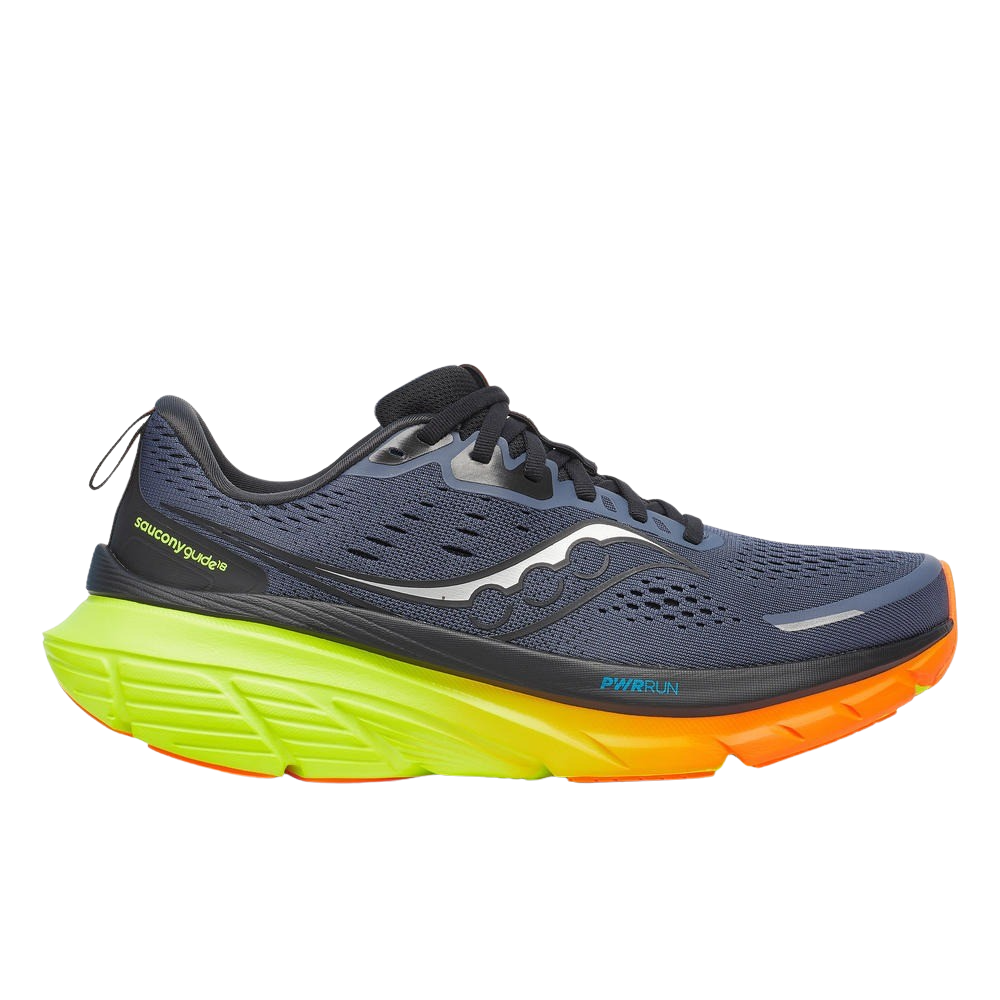 Saucony Guide 18 – Komfort und Schutz in Perfektion Der Saucony Guide 18 ist dein neuer Max-Dämpfungs-Trainingsschuh, der Komfort und Schutz vereint. Mit weichem, reaktivem PWRRUN-Schaum und der innovativen Center Path Technology sorgt der Schuh für ein zentriertes und unterstützendes Laufgefühl. Dank höherer Seitenwände und einem modernen Rocker-Design bietet er dir Stabilität und ein einzigartig angenehmes Tragegefühl. Ob tägliche Trainingseinheit oder lange Läufe – der Guide 18 ist dein verlässlicher Partner. Was macht den Saucony Guide 18 besonders? Maximale Dämpfung: Die breite Basisgeometrie sorgt für ein stabiles Laufgefühl und eine komfortable Landung, während dein Fuß tief in der stabilen Plattform sitzt. Center Path Technology: Zentriert den Fuß von der Landung bis zum Abrollen und garantiert eine ausgewogene und unterstützende Laufbewegung. Reaktiver PWRRUN-Schaum: Weiche und reaktionsfreudige Dämpfung für geschmeidige und komfortable Kilometer. Langlebige XT-900 Außensohle: Bietet dir hervorragenden Grip und Strapazierfähigkeit für viele Laufkilometer. Atmungsaktives Obermaterial: Das speziell entwickelte Mesh sorgt für optimale Luftzirkulation und unterstützt den Fuß dort, wo es nötig ist. Technische Details: Bestens geeignet für: Tägliche Läufe Dämpfung: PWRRUN Einlegesohle: PWRRUN+ Sprengung: 6 mm (Ferse: 35 mm / Vorfuß: 29 mm) Gewicht: Herren 272 g (9.6 oz) Nachhaltigkeit: Vegan und enthält recycelte Materialien Mit dem Saucony Guide 18 genießt du weichen Komfort und zuverlässige Unterstützung – perfekt für jeden Lauf.