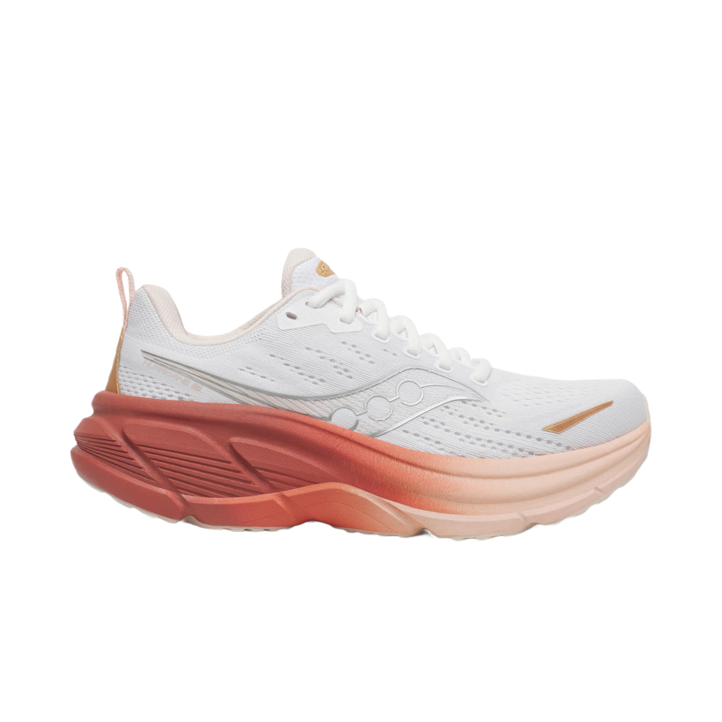 Saucony Hurricane 25 Damen – Stabilität trifft auf luxuriösen Komfort Der Hurricane 25 wurde speziell für Läuferinnen entwickelt, die sich zuverlässige Stabilität und ein ultrakomfortables Laufgefühl wünschen. Die Kombination aus PWRRUN PB-Superfoam und einer medienlastigen Zwischensohlengeometrie sorgt für sanfte Landungen und eine zentrierte, geschmeidige Abrollbewegung. Dabei bleibt die Dämpfung angenehm weich und reaktionsfreudig – auch auf langen Strecken. Ein atmungsaktives Mesh-Obermaterial umschließt den Fuß sicher, während gepolsterte Details an Schaft, Zunge und Einlegesohle für höchsten Komfort sorgen. Die überarbeitete Außensohle mit XT-900 Gummi bietet langlebige Traktion auf allen Untergründen. Technische Details: Gewicht: 252 g Sprengung: 6 mm Zwischensohle: PWRRUN PB & mediale PWRRUN Struktur Einlegesohle: SRS Komfortsockliner Außensohle: XT-900 Carbon Rubber Obermaterial: Weiches, luftiges Mesh mit hohem Tragekomfort Besonderheit: 5 mm mediale Plattformverschiebung für mehr Unterstützung Ein Stabilschuh für Läuferinnen, die das Maximum an Komfort, Halt und Schutz suchen – ohne auf eine moderne, geschmeidige Laufeigenschaft zu verzichten.