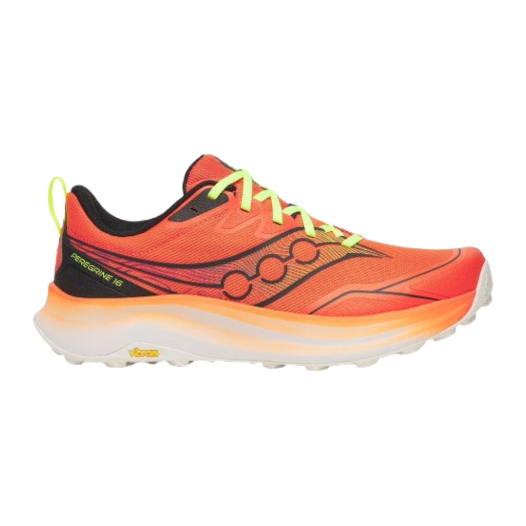 Saucony Peregrine 16 Herren – Agilität, Grip und Schutz auf jedem Trail Der Saucony Peregrine 16 Herren kombiniert Leichtigkeit, Präzision und Robustheit für technische Trails und lange Läufe im Gelände. Die neu abgestimmte PWRRUN Zwischensohle bietet mit 16 % mehr Schaum eine weiche, reaktive Dämpfung, während die PWRRUN+ Einlegesohle zusätzlichen Komfort und Energierückgabe liefert. So entsteht ein direktes, kontrolliertes Laufgefühl – ideal für Läufer, die Stabilität und Dynamik auf unebenem Terrain suchen. Die Vibram® Megagrip-Außensohle sorgt für hervorragende Traktion auf Felsen, Wurzeln und matschigen Trails – selbst bei Nässe. Das hochfeste Mesh-Obermaterial bietet 400 % höhere Abriebfestigkeit und 90 % mehr Reißfestigkeit für maximale Langlebigkeit. Eine integrierte Rock Guard Plate schützt den Vorfuß vor spitzen Steinen, während die flexible Konstruktion ein natürliches Abrollen ermöglicht. Mit seinem niedrigen Profil und der direkten Bodenverbindung ist der Peregrine 16 der perfekte Partner für technisch anspruchsvolle Läufe. Deine Vorteile im Überblick PWRRUN Zwischensohle: 16 % mehr Schaum für weiche, reaktive Dämpfung PWRRUN+ Einlegesohle: Ergänzt das Dämpfungssystem mit zusätzlicher Rückfederung Vibram® Megagrip: Überragender Grip auf nassem und trockenem Untergrund Rock Guard Plate: Schützt vor Steinen und sorgt für Stabilität bei Flexibilität Hochfestes Mesh: 400 % abrieb- und 90 % reißfester für maximale Haltbarkeit Niedriges Profil: Direkter Bodenkontakt für präzise Kontrolle und Agilität Technische Details Gewicht: 282 g (Herren) Sprengung: 4 mm (Ferse 33 mm / Vorfuß 29 mm) Dämpfung: PWRRUN Foam + PWRRUN+ Sockliner Obermaterial: High-Strength Mesh mit Rock Guard Schutz Außensohle: Vibram® Megagrip Laufstil: Trail / Neutral Der Saucony Peregrine 16 Herren verbindet Grip, Schutz und Flexibilität zu einem dynamischen Trailrunning-Erlebnis – für Läufer, die auf jedem Untergrund Kontrolle und Sicherheit erwarten.