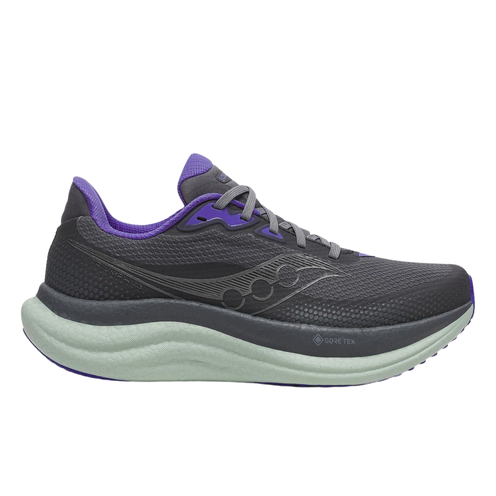 Saucony Triumph 23 GTX Damen – Luxuriöse Dämpfung mit wasserdichtem Schutz Der Triumph 23 GTX bietet dir maximalen Komfort für nasse Tage – mit einem wasserfesten Mesh-Obermaterial, das dank GORE-TEX® Invisible Fit leicht und flexibel bleibt. Die PWRRUN PB-Zwischensohle liefert hervorragende Energierückgabe bei einem angenehm soften Laufgefühl – ideal für regelmäßige Trainingseinheiten auf langen Distanzen. Die überarbeitete XT-900-Außensohle bietet mehr Flexibilität und langanhaltende Traktion, während die SRS-Einlegesohle für ein spürbar angenehmes Tragegefühl sorgt. Der Triumph 23 GTX ist vegan, nachhaltig verarbeitet und begleitet dich zuverlässig durch Regen, Wind und Kälte. Technische Details: Gewicht: 261 g Sprengung: 10 mm (37 mm / 27 mm) Dämpfung: PWRRUN PB Wasserdichtes Obermaterial mit GORE-TEX Invisible Fit Komfortable SRS-Einlegesohle XT-900-Außensohle für Langlebigkeit und Grip Vegan und mit recycelten Materialien gefertigt Ein wasserdichter Trainingsschuh für Läuferinnen, die Komfort, Leistung und Schutz auch bei schlechtem Wetter erwarten.