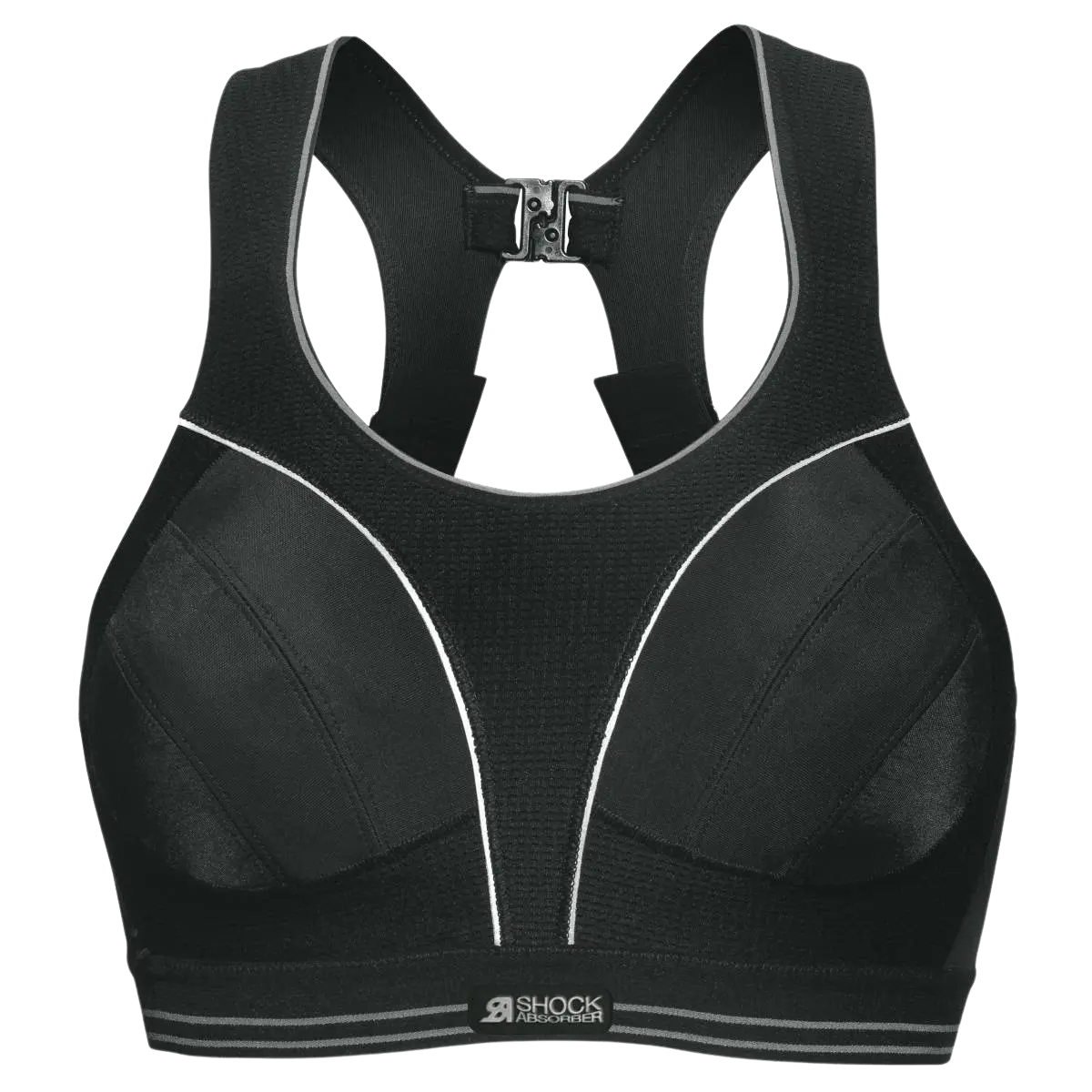 Shock Absorber Ultimate Run Sport-BH – Reduziert die Brustbewegung beim Laufen um ultimative 78%. Details zum Shock Absorber Ultimate Run Sport-BH: Ringerrücken für hohe Bewegungsfreiheit Das Infinity-8 Support System stützt die Brust, die sich beim Laufen wie eine liegende 8 bewegt Weiches, nahtloses Design im Innen-Cup verhindert Scheuern Hoher Tragekomfort durch gepolsterte, verstellbare Träger und Gel-Komfortpolster Sportives Design durch Doppelstreifen am Unterbrustband Atmungsaktive Fasern Support Level: 4 Das steht für höchste sportliche Aktivität, z.B. Laufen, Reiten, Voleyball, Handball, Tennis, Basketball Fakt : 44% * der Frauen, die regelmäßig Sport treiben, tragen keinen Sport-BH SPEZIELLE EIGENSCHAFTEN bieten maximalen Halt und perfekten Komfort. Quick dry Feuchtigkeits-transport Haltbarkeit Atmungs-aktiv Größen: B/C/D/E ; 70 – 85 Material: 81 % Polyamid, 10 % Polyester, 9 % Elastan Farben: schwarz