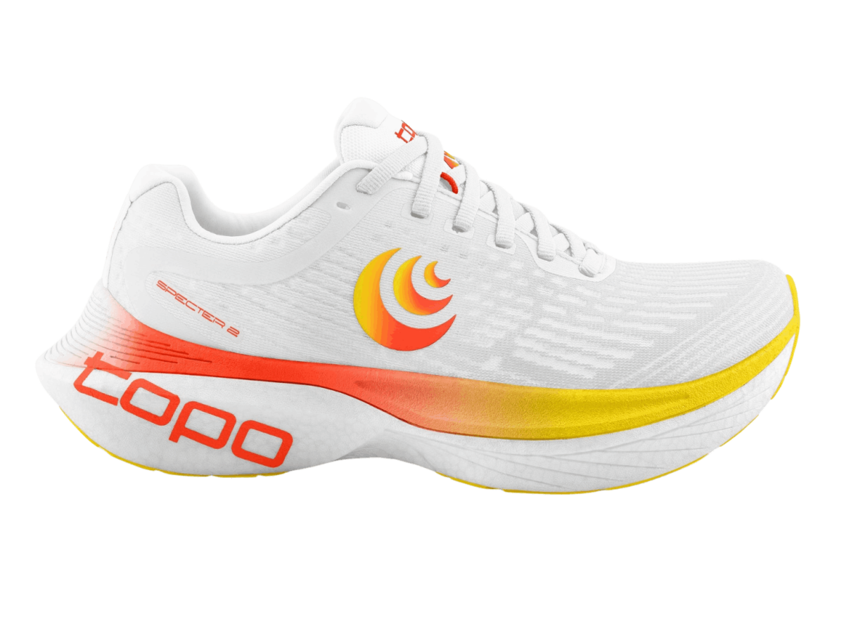 Der Topo SPECTER 2 ist die ideale Wahl für Läufer, die auf der Suche nach einem leichten, dynamischen und komfortablen Laufschuh sind. Dieser Schuh kombiniert modernste Technologien, um Deine Laufleistung zu maximieren und gleichzeitig hohen Komfort zu bieten. Die vollflächige, reaktive Pebax® (TPE-A) Zwischensohlentechnologie sorgt für eine herausragende Energierückgabe, während das ultraleichte Sohlendesign mit einer extrem flachen Non-Slip Roadsohle und Verstärkungen in den Lastbereichen für optimale Stabilität sorgt. Das zweiteilige Ultralight (UL) Funktionsmesh des Obermaterials bietet eine hohe Atmungsaktivität und hält Deine Füße auch bei intensiven Läufen kühl und trocken. Die mittelfußbalancierte Konstruktion des Specter 2 sorgt für ein besonders leichtes Laufgefühl, während die komfortable Passform mit einer natürlichen Zehenbox und einem speziell geformten Leisten für perfekten Sitz und maximale Bewegungsfreiheit sorgt. Die super Cushion Dämpfung und die stützende Komfort-Fersenkappe bieten zusätzlichen Komfort und Halt. Das antimikrobielle, orthopädisch geformte Ortholite-Fußbett und die Zehen- und Fersen-Rocker für ein dynamisches, schnelles Abrollen runden das Gesamtpaket ab und machen den Topo Specter 2 zu einem unverzichtbaren Begleiter auf allen Straßenstrecken und bei Tempotrainings. Highlights des Topo SPECTER 2 Laufschuh für Herren: Modernste Zwischensohlentechnologie aus vollflächigem, reaktivem Pebax® (TPE-A) +2 mm mehr Dämpfung Ultralight-Sohlendesign mit extrem flacher Non-Slip Roadsohle und Verstärkungen in Lastbereichen Am Mittelfuß ausbalanciert für ein besonders leichtes Laufgefühl Komfortable Passform dank natürlicher Zehenbox und Leisten-Shaping Obermaterial aus zweiteiligem Ultralight (UL) Funktionsmesh mit hoher Atmungsaktivität Super Cushion Dämpfung Stützende Komfort-Fersenkappe Antimikrobielles und orthopädisch geformtes Ortholite-Fußbett Zehen- und Fersen-Rocker für ein dynamisches, schnelles Abrollen Komfortzunge mit Schnürsenkelführung Vergleichbare Schuhe: Saucony Endorphin Speed 3, Hoka Mach X Sprengung: 5 mm Gewicht: 236 g (US 9, Herren)