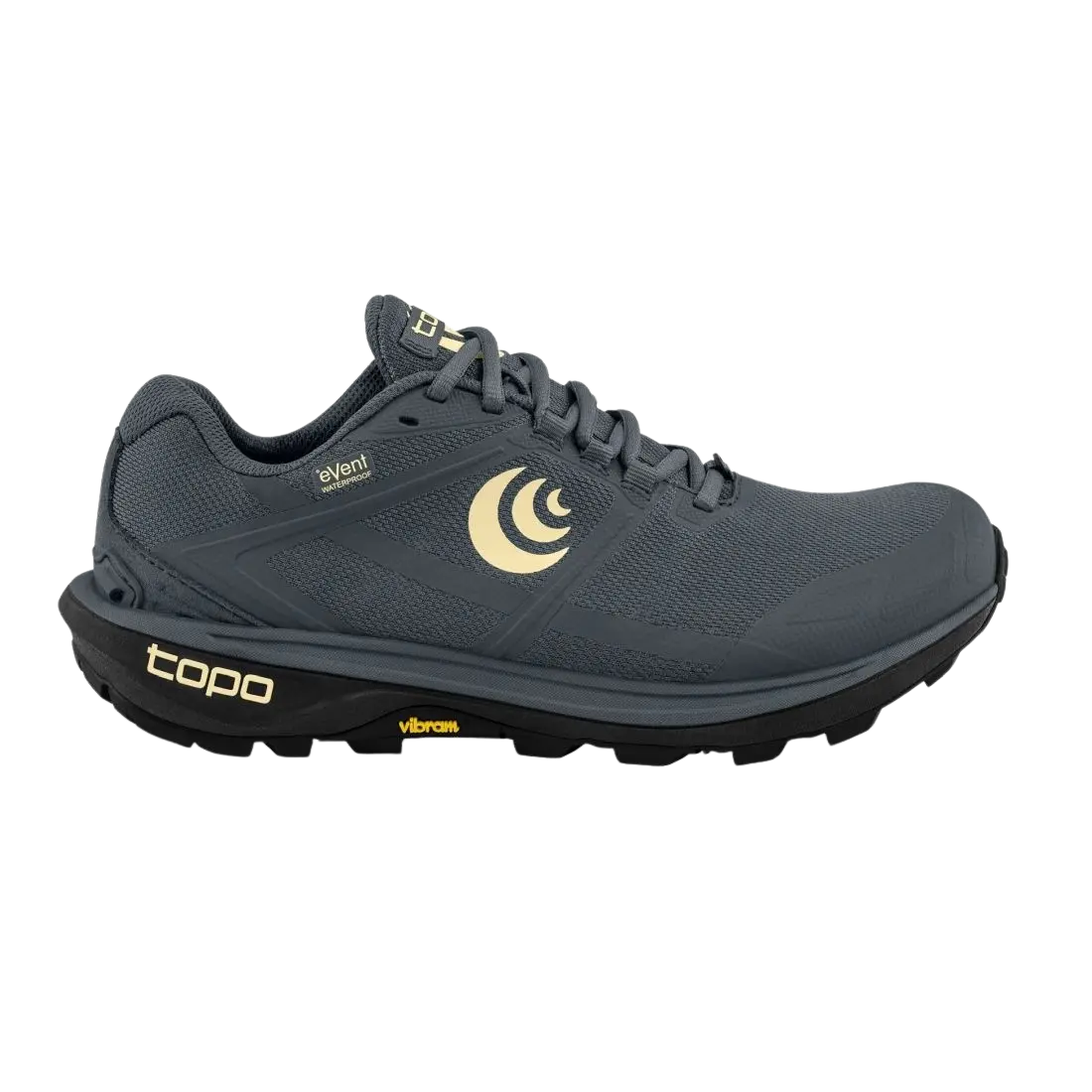 Topo Athletic Terraventure 4 WP Damen – ein Allwetter-Bergfex mit maximalem Komfort Der Topo Athletic Terraventure 4 WP bringt dich trocken und sicher durch jedes Gelände – ganz gleich, was das Wetter vorhat. Aufbauend auf dem bewährten Terraventure 4 bietet diese wasserdichte Version dank eVent®-Membranbootie zuverlässigen Nässeschutz, ohne zusätzliches Gewicht. Das fein gewobene, schmutzabweisende Mesh bleibt dabei hoch atmungsaktiv – ideal für wechselhafte Bedingungen auf langen Trailabenteuern. Die Kombination aus komfortablem ZipFoam®-Dämpfungsmaterial, einem 5 mm starken Ortholite® X25-Fußbett und der flexiblen ESS-Rockplate im Vorfußbereich sorgt für eine optimale Mischung aus Schutz, Reaktivität und direktem Bodenfeedback. Die Vibram® Megagrip-Außensohle mit multidirektionalem Profil bietet verlässlichen Halt auf nassen Wurzeln, losem Geröll und sogar verschneiten Trails. Mit Features wie Gaiter-Anschlüssen, seitlich vernähter Zunge und umlaufendem Zehenschutz ist dieser Schuh für Läufer gemacht, die das Abenteuer bei jedem Wetter suchen. Deine Vorteile im Überblick: Wasserdichter eVent®-Membranbootie für trockene Füße bei jedem Wetter ZipFoam®-Zwischensohle für dynamische Dämpfung und langanhaltenden Komfort Vibram® Megagrip-Außensohle mit exzellentem Grip und Selbstreinigung Ortholite® X25-Einlegesohle für weiches Fußbett und antibakterielle Frische ESS-Rockplate schützt vor spitzen Steinen, ohne das Laufgefühl zu beeinträchtigen Robustes Obermaterial mit natürlicher Zehenbox und sicherem Sitz Technische Details: Sprengung: 3 mm Gewicht: 286 g Zwischensohle: ZipFoam® (EVA-/TPU-Mix) Außensohle: Vibram® Megagrip mit multidirektionalem Profil Schutz: ESS-Rockplate im Vorfuß, umlaufender Zehenschutz Ein vielseitiger Trailschuh für Läuferinnen, die sich auf anspruchsvollem Terrain bei jeder Witterung zuhause fühlen.