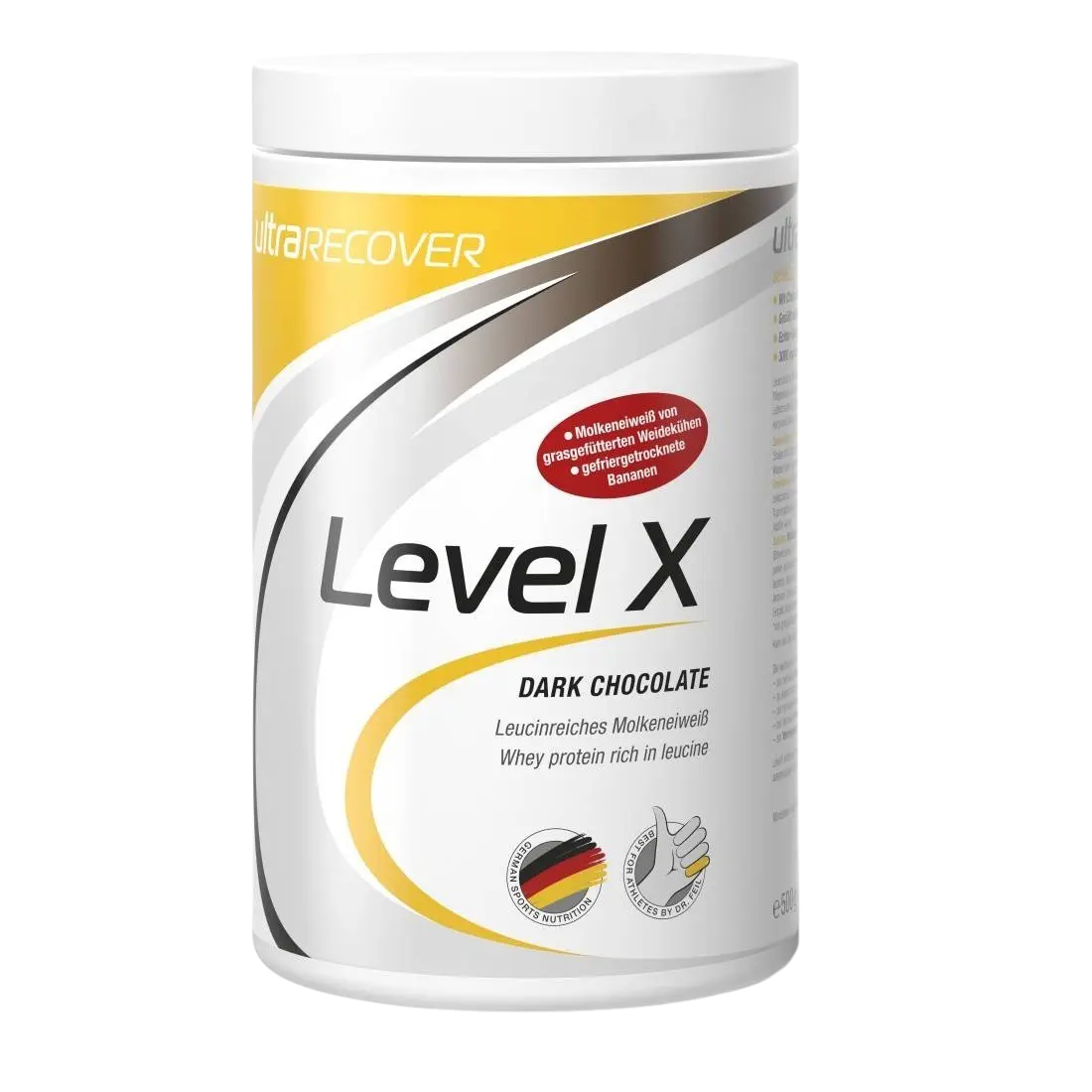 UltraRECOVER Level X Dark Chocolate – Leucinreiches Molkeneiweißkonzentrat mit Vitaminen, Zink, Magnesium und Selen. Eine Optimierung im Herstellungsprozess bringt ein besseres Auflösungsverhalten – NEU: besser löslich! Produktneuerungen Neu: Echter Geschmack durch gefriergetrocknete Früchte Neu: Hochwertiges Molkeneiweiß von grasgefütterten Weidekühen (laktosearm) Gesüßt mit Birkenzucker und Stevia / Frei von sonstigen Süßstoffen Die wertvollen Inhaltsstoffe von Level X liefern einen Beitrag zu einem normalen Fettstoffwechsel (Cholin), zur normalen Immunfunktion (Selen, Zink und Vitamin B6), zur normalen Muskelfunktion (Vitamin D3), zur Verringerung von Ermüdung und Erschöpfung (Magnesium; Vitamin B6), zurnormalen Proteinbildung (Zink), zur Erhaltung der Muskulatur /zum Muskelaufbau (Protein). Zutaten: Molkenproteinkonzentrat* (52 %, laktosearm), Süßungsmittel (Birkenzucker 14 %, Steviolglykoside 0,1 %), Kakaopulver (13 %), Bananenpulver (gefriergetrocknet, 11 %), Emulgatoren (Sonnenblumenlezithin, Sojalezithin), Magnesiumcitrat, L-Leucin, Zinkcitrat, Ingwerextrakt, natürliche Aromen, Cholinbitartrat, Rhodiola-Rosea-Extrakt (0,44 %), Zimt, Bourbon-Vanille-Extrakt, Maltodextrin, Vitamin B6, Vitamin D3, Natriumselenat. *von grasgefütterten Weidekühen Anwendung: 45 g Pulver (3 leicht gehäufte Esslöffel) in 200 ml Wasser / Milch einrühren. Besonderheiten: glutenfrei und laktosefrei, wenn mit Wasser oder laktosefreier Milch zubereitet Inhalt: 1 Dose Level X Dark Chocolate enthält 550 g = 2,2 l, das entspricht 11 Portionen à 50 g Geschmacksrichtung: Dark Chocolate